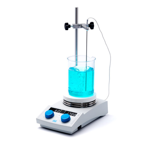 Bezpieczne i wydajne, cyfrowe mieszadło magnetyczne z grzaniem AREX-6 Digital z kontrolą temperatury za pomocą sondy PT100. Posiada timer (1 min – 99 h) i funkcję zmiany kierunku mieszania. Zaawansowany, wyraźny wyświetlacz LED (jasne, białe oznaczenia na czarnym tle) jest intuicyjny i łatwy do odczytania. Płyta grzewcza wykonana jest ze stopu aluminium (gwarantującego jednorodność temperatury i szybkie przenikanie ciepła), który powleczony jest cienką warstwą ceramiki (dla większej odporności chemicznej i mechanicznej). Regulacja temperatury jest wyjątkowo dokładna, stabilna i szybka. Urządzenie posiada podświetlane ikony informujące o podłączeniu sondy, aktywacji grzania, ustawionej temperaturze, ustawionej funkcji timera, a także o opcji zmiany kierunku mieszania. Praca mieszadła sterowana jest przez dwa pokrętła. Naciśnięcie dwóch pokręteł jednocześnie pozwala na dostęp do menu zaawansowanego.