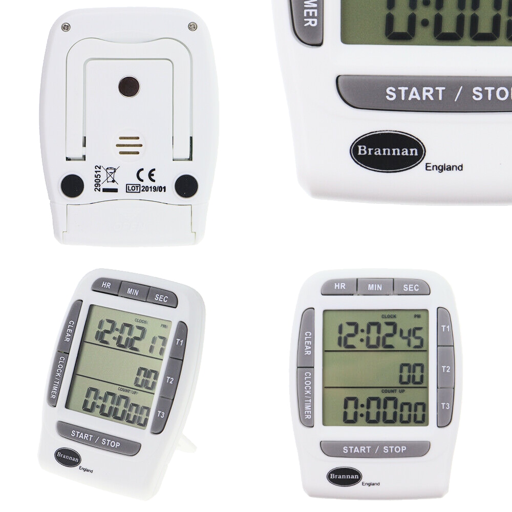 Stoper, czasomierz oraz zegarek w jednym z odliczaniem kończącym się alarmem. W zegarku Brannan ™ z wyświetlaczem LCD, wszystkie trzy timery mogą działać jednocześnie. Tylna część posiada zacisk, podstawę i magnes.