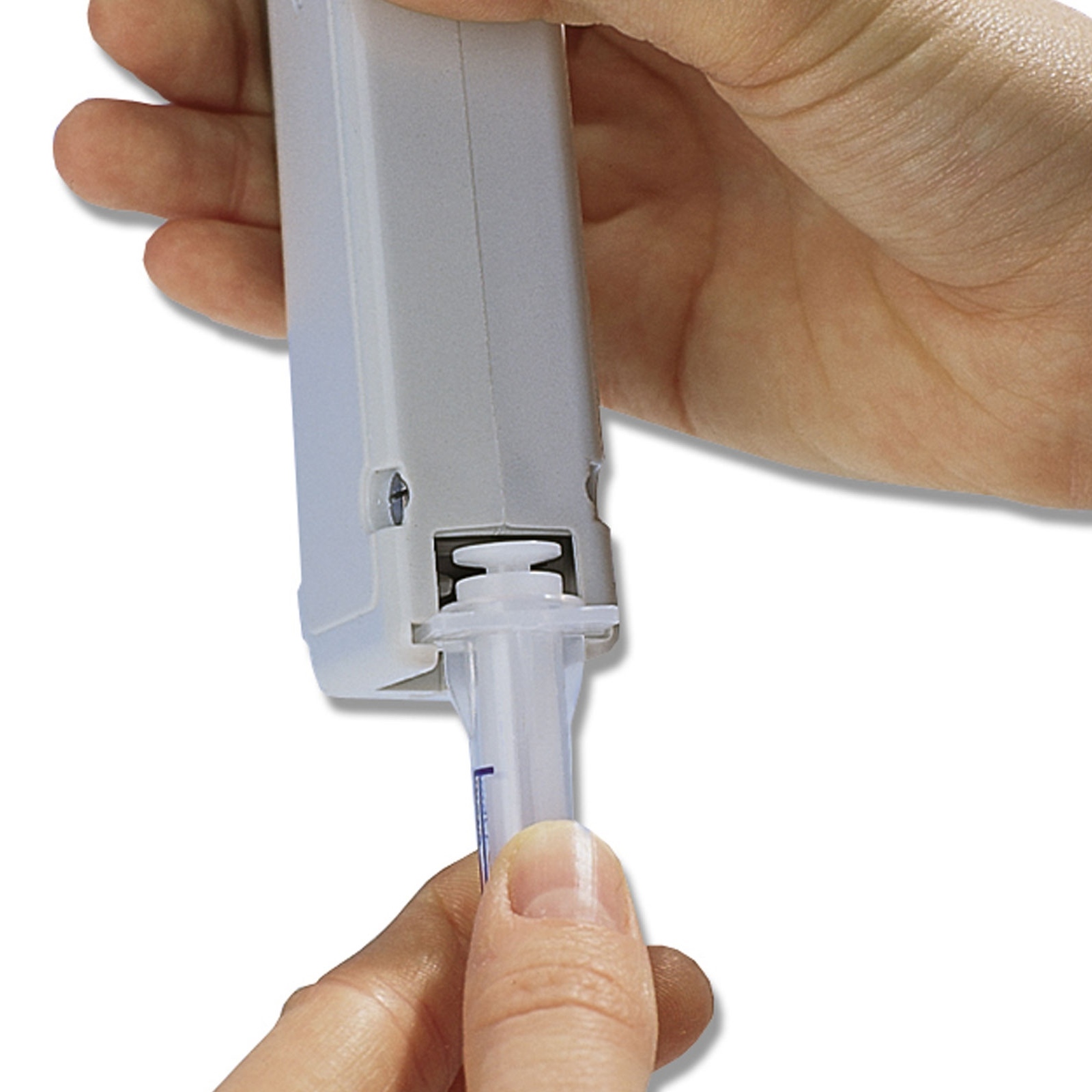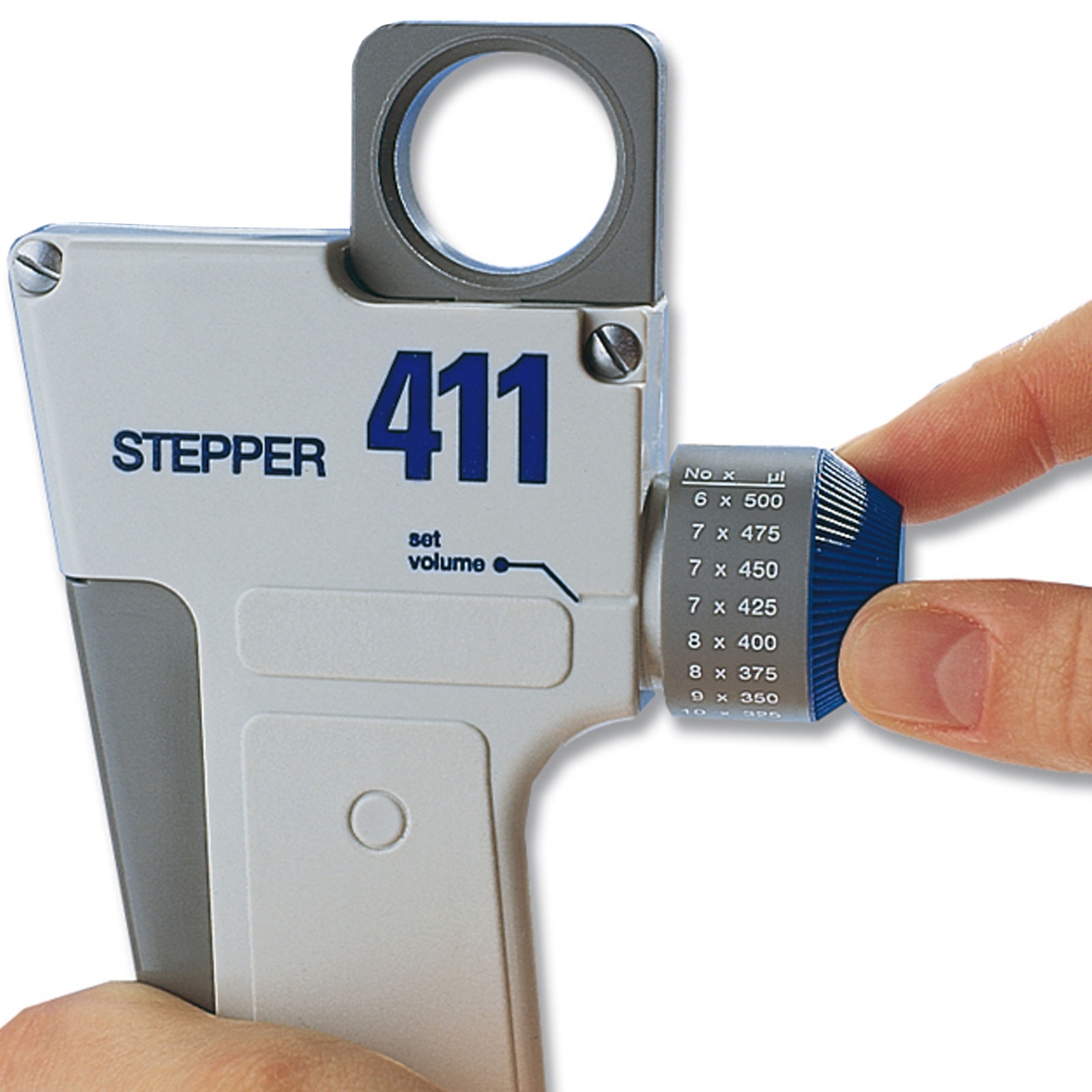 Dozownik strzykawkowy Stepper™ 411 – idealny do seryjnego pipetowania. Posiada 3 zakresy objętości. Odpowiednie, kolorowo kodowane pokrętło należy założyć na pipetę i włożyć właściwą końcówkę. Pokrętło nastawia się na wybraną objętość, która jednocześnie wskazuje ilość pipetowań. Końcówki należy zamówić osobno. Dozownik strzykawkowy Stepper™ 411 jest produkowany w Szwajcarii.