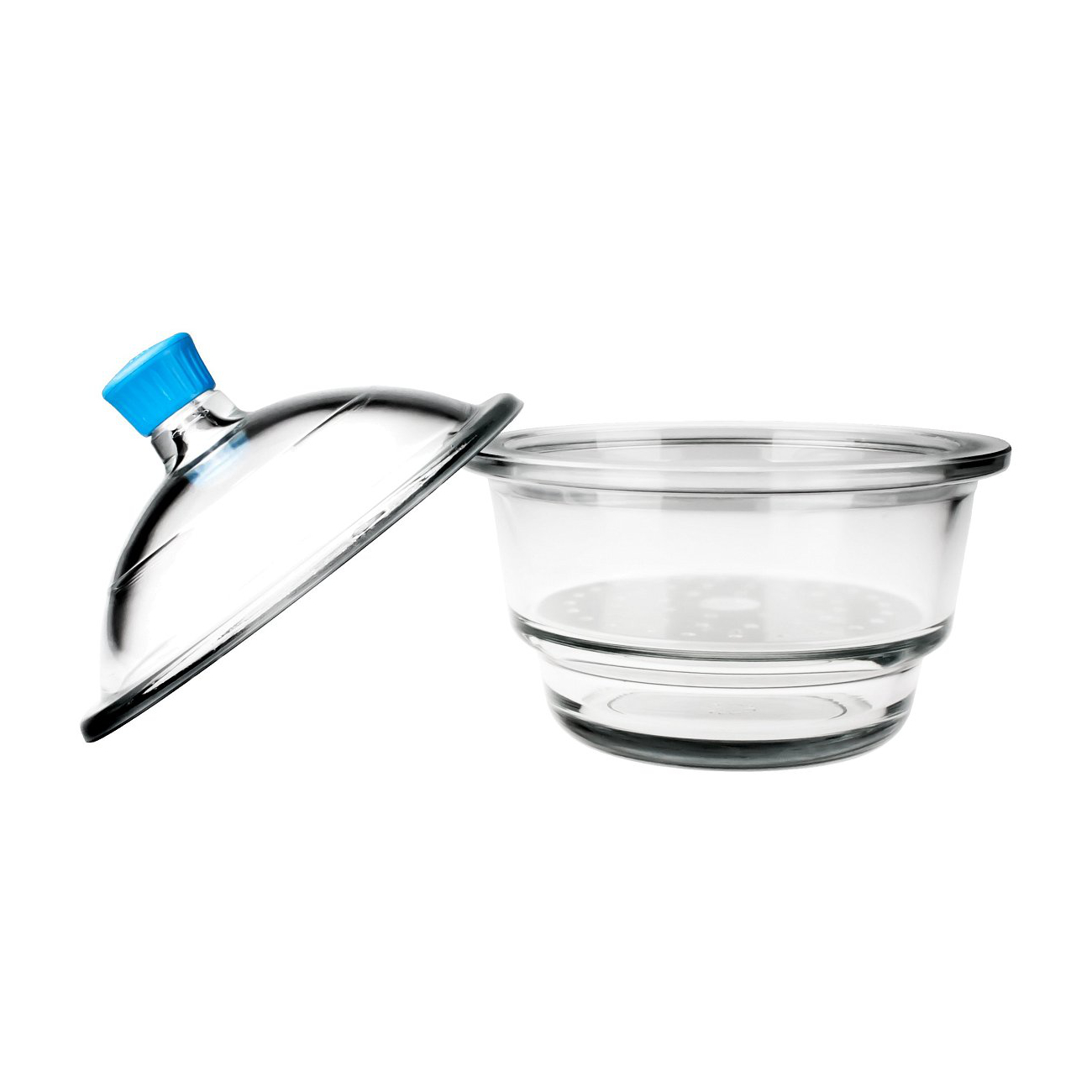 Eksykator ze szkła Simax bez zaworu. Wyposażony w plastikowy uchwyt na pokrywie. Umożliwia długotrwałe przechowywanie próbek higroskopijnych oraz powolne osuszanie. W zestawie dostarczana jest płytka porcelanowa.