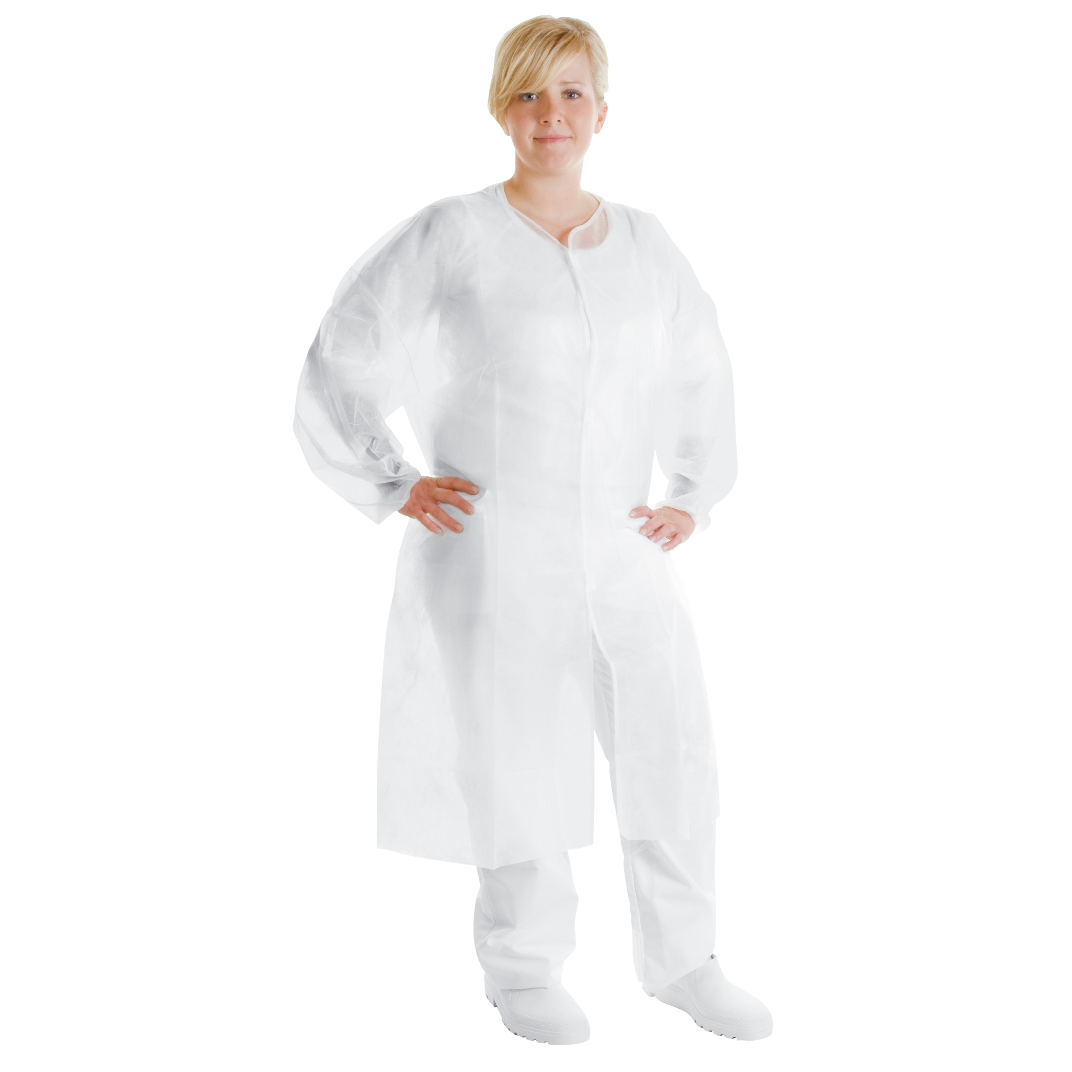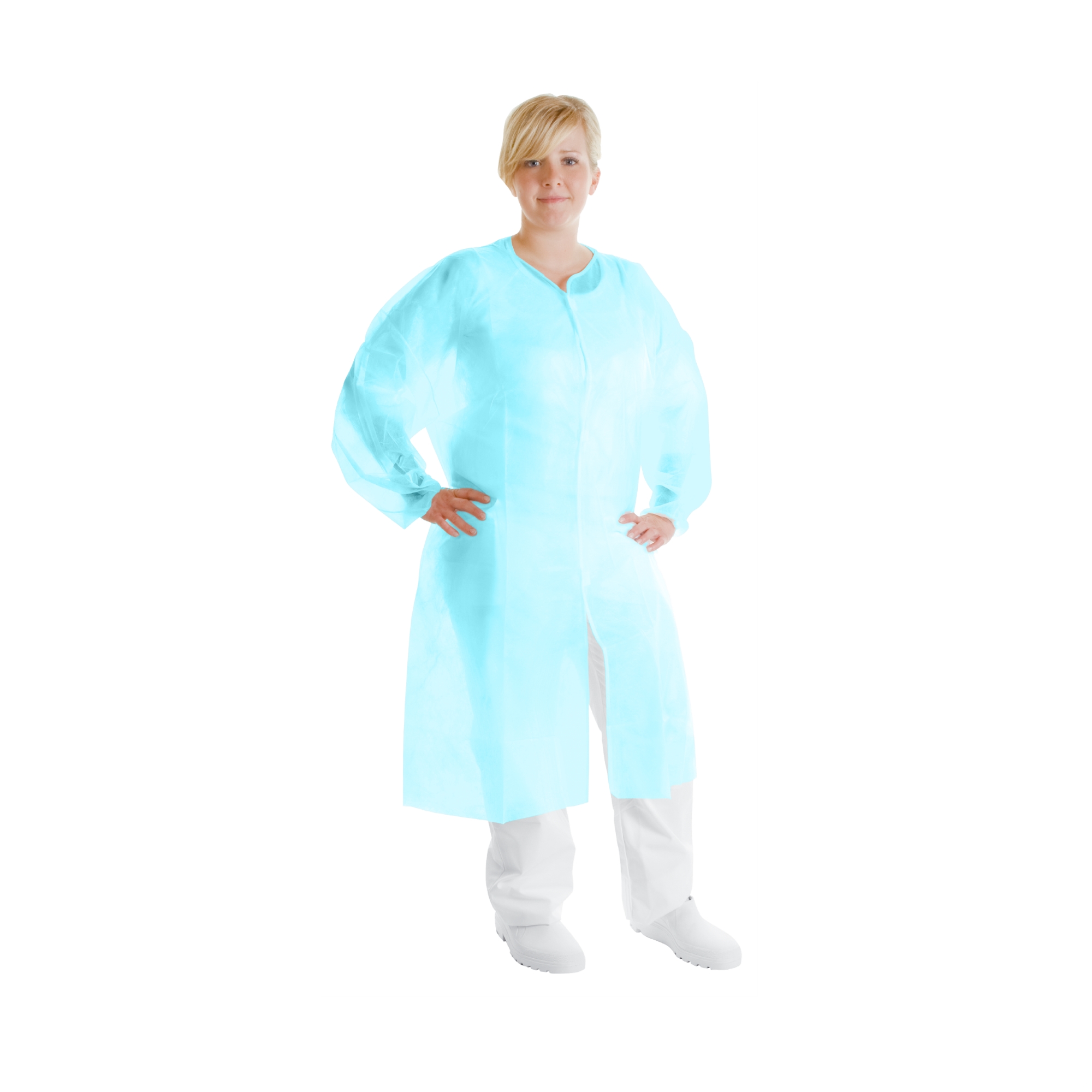 Fartuchy jednorazowego użytku. Wykonane z antystatycznej włókniny polipropylenowej. Z rękawami zakończonymi gumką oraz zapięciem na rzepy z przodu, umożliwiającym wygodne zakładanie. Dostępne w kolorach białym i niebieskim. Znakomity krój zapewnia większą swobodę ruchu. Dzięki antystatycznym właściwościom materiału nie przyklejają się do ciała ani nie unoszą w czasie chodzenia.