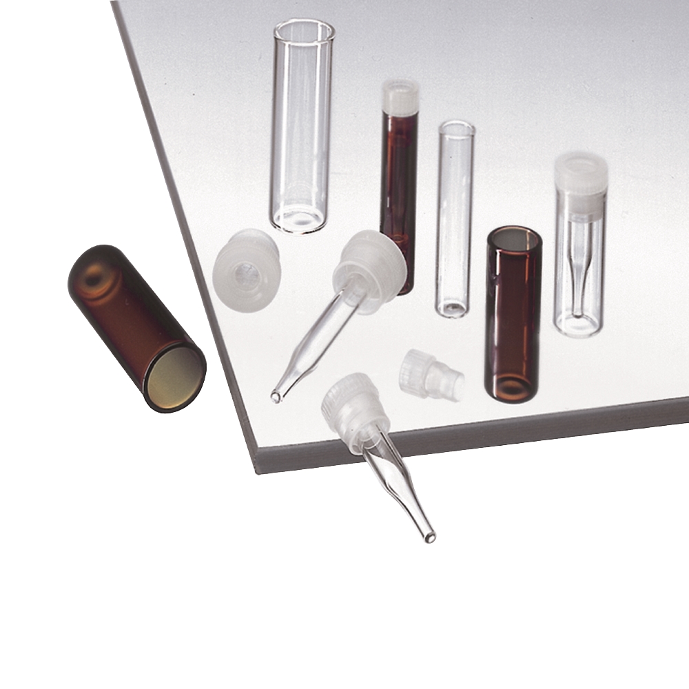 Dla fiolek z płaskim dnem o poj. 1 ml dostępne są korki z wsuwaną blokadą dla mikrowkładów lub bez blokady.