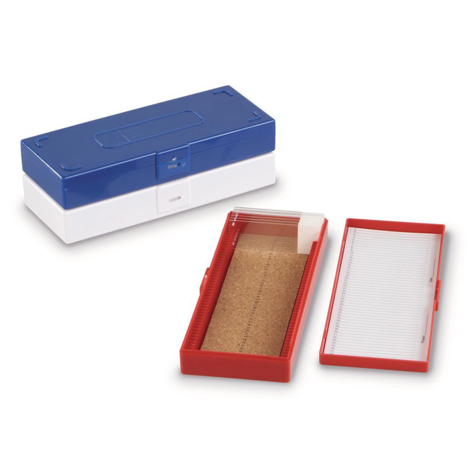 Kasetki z tworzywa ABS do przechowywania standardowych szkiełek mikroskopowych w ponumerowanych, rowkowanych otworach. Z wkładem korkowym, nakładaną pokrywą i kartą indeksową. Zapewniają bezpieczne, bezpyłowe przechowywanie i transport do 50 szkiełek mikroskopowych.