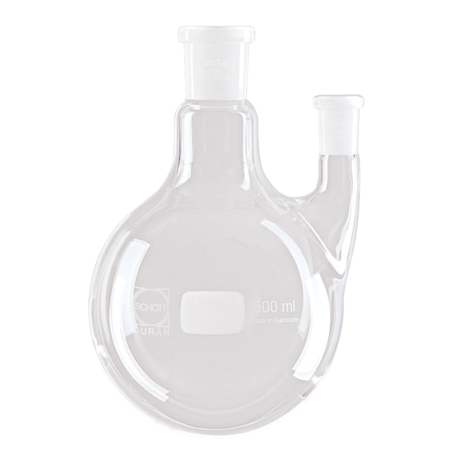 Dwuszyjne kolby kuliste Lenz wykonane ze szkła Duran. Szyja główna zakończona standardowym szlifem NS 29/32. Szyja boczna ułożona równolegle do głównej posada szlif NS 14/23 lub NS 29/32.