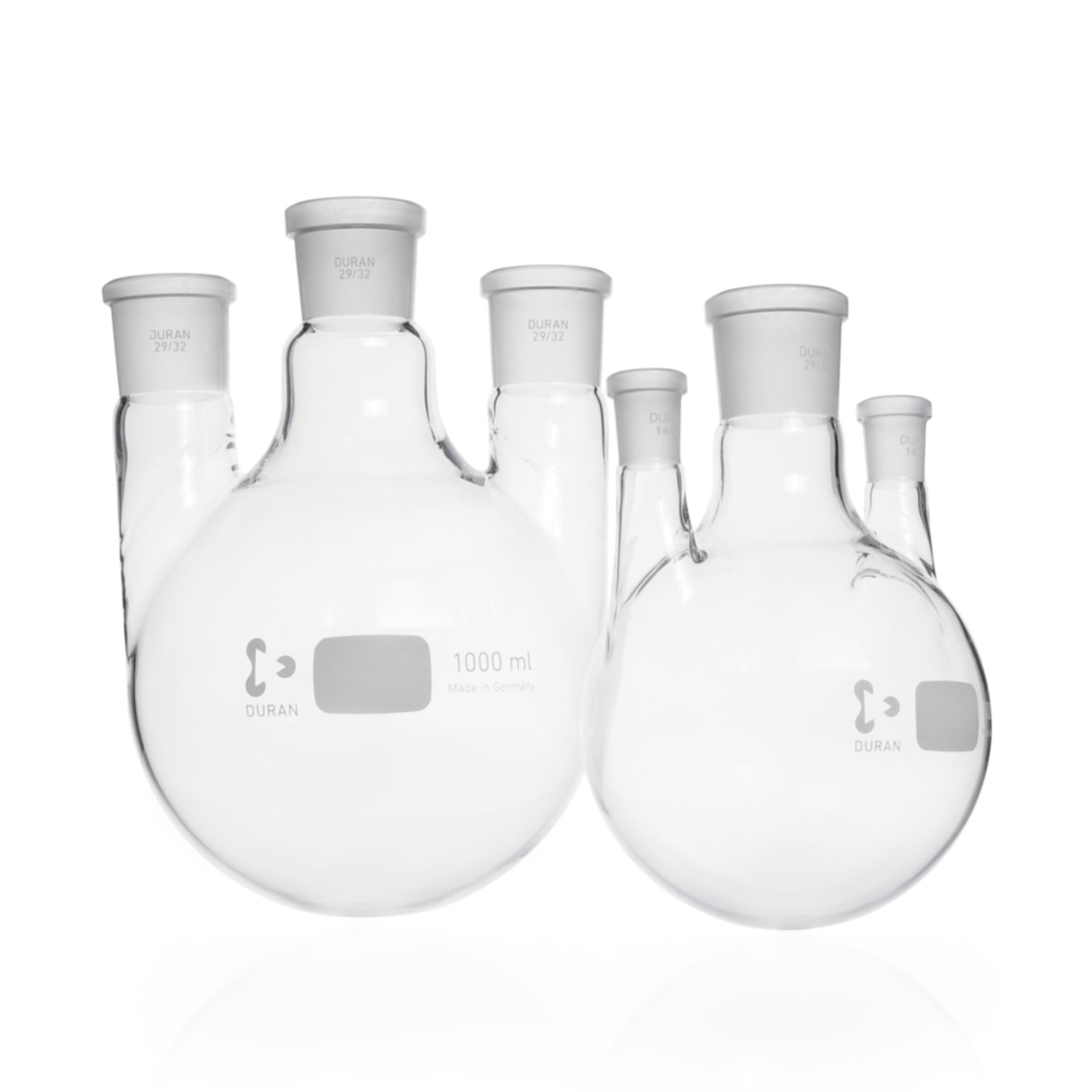 Okrągłodenne kolby trójszyjne Duran z szyjami prostymi. Szyja centralna ze standardowym szlifem NS 24/29 lub 29/32. Dwie szyjki boczne ze szlifem NS 14/23, NS 19/26 lub NS 29/32. Kolby wykonane ze szkła borokrzemowego 3.3. Biały, wypalany nadruk.