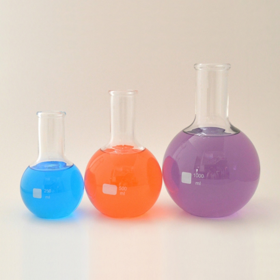 Kolby płaskodenne z wąską szyją bez szlifu. Wykonane ze szkła borokrzemowego.