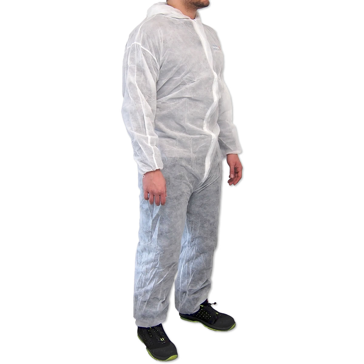 Kombinezon ochronny z włókniny polipropylenowo-flizelinowej pokrytej polietylenem. Pozwala na szczelne i kompleksowe zabezpieczenie całego ciała przez zamoczeniem lub zabrudzeniami. Posiada kaptur, gumki na rękawach i nogawkach. Zapinany jest na ukryty zamek błyskawiczny.