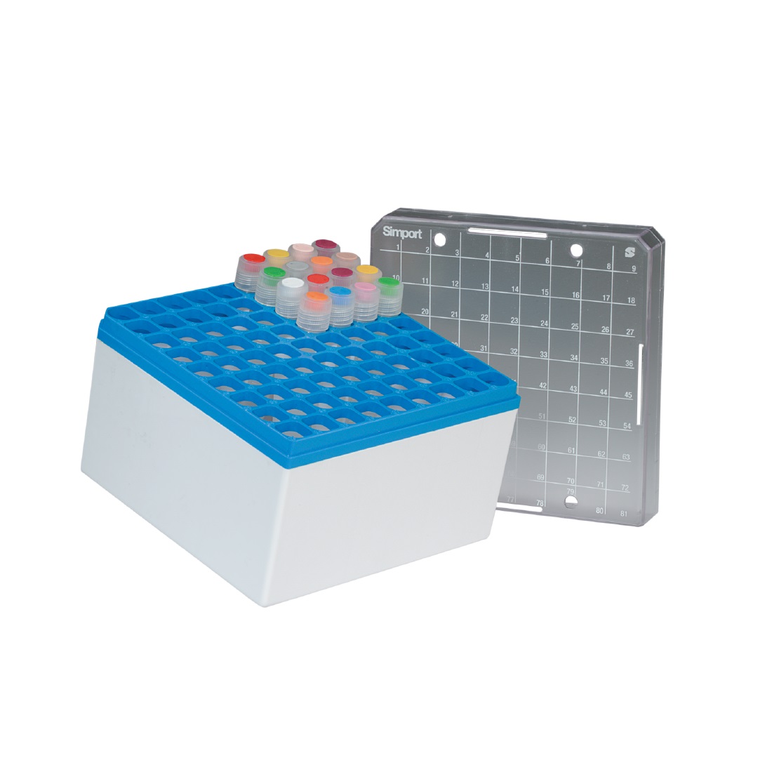 Pudełka na probówki o poj. 3 do 5 ml i śr. 12,5 mm. Rzędy 9 x 9. Wykonane ze stabilnego poliwęglanu. Odporne na temperatury od -190°C do +121°C. Składają się z dolnej części w kolorze białym, kolorowej kratki i przeźroczystej pokrywki z oznaczeniami alfanumerycznymi dla szybkiej identyfikacji próbek.