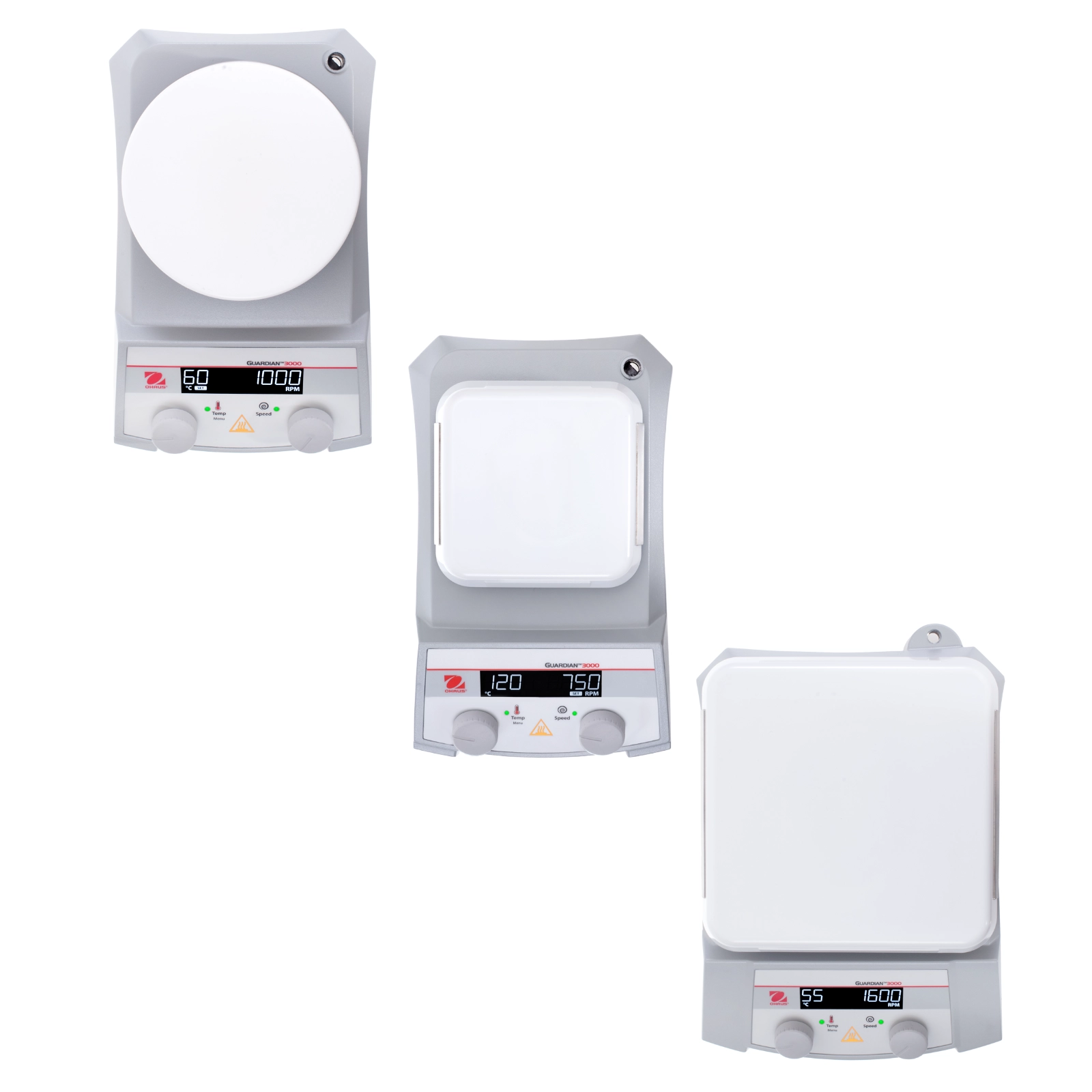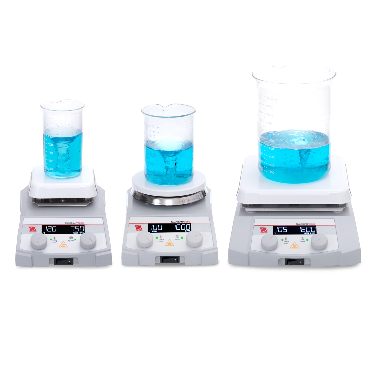 Mieszadła magnetyczne Guardian™ 3000 posiadają podświetlany wyświetlacz LCD wskazujący temperaturę płyty oraz prędkość mieszania. Ikona informuje o zastosowaniu sondy zewnętrznej, a ikona kalibracji jednopunktowej potwierdza zwiększoną dokładność grzania w wybranej przez użytkownika temperaturze. Ponadto na panelu sterowania urządzenia zainstalowano dodatkowe wskaźniki: