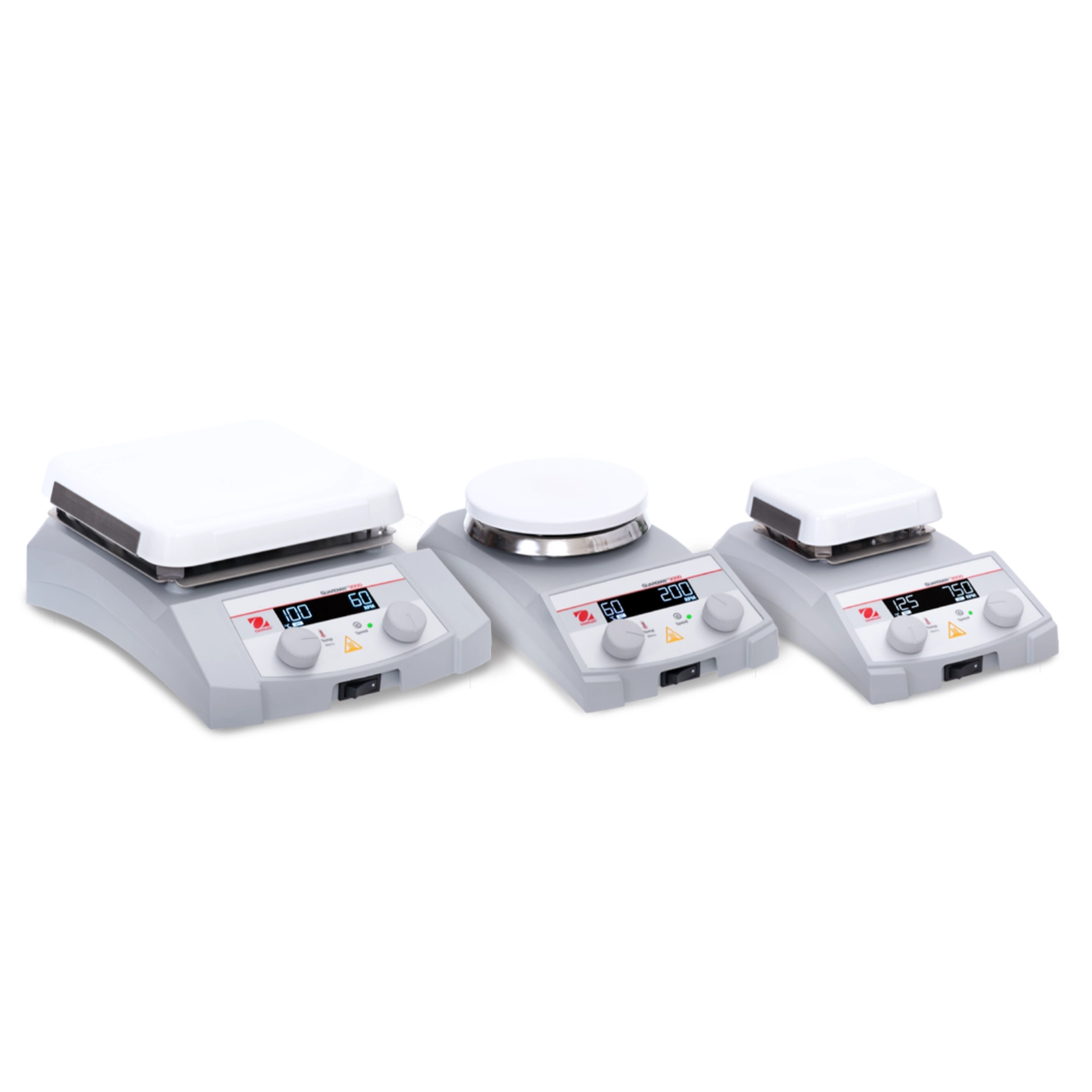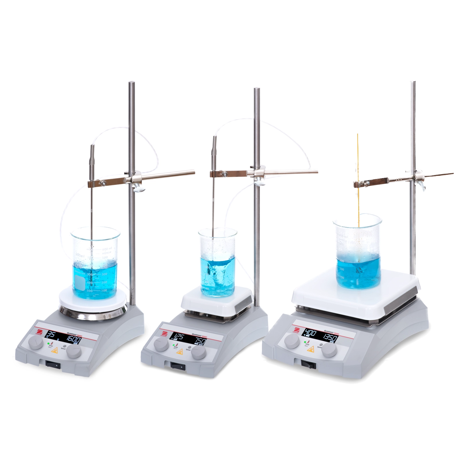 Mieszadła magnetyczne z grzaniem Guardian™ 3000 firmy Ohaus doskonale nadają się do zastosowań laboratoryjnych, wymagających w codziennej pracy szybkiego podgrzewania i niezawodnego mieszania objętości nieprzekraczających 15 l. Podgrzewanie i mieszanie z prędkością od 80 do 1600 obr./min można płynnie, łatwo regulować za pomocą pokręteł. Płyty robocze mają trzy warianty wielkości. Kwadratowe płyty ceramiczne podgrzewają do 500°C. Są łatwe do czyszczenia, gładkie i odporne na chemikalia. Z kolei okrągłe płyty o średnicy 135 mm wykonano ze stali nierdzewnej dodatkowo powleczonej warstwą ceramiczną. Grzeją do temperatury 380°C.