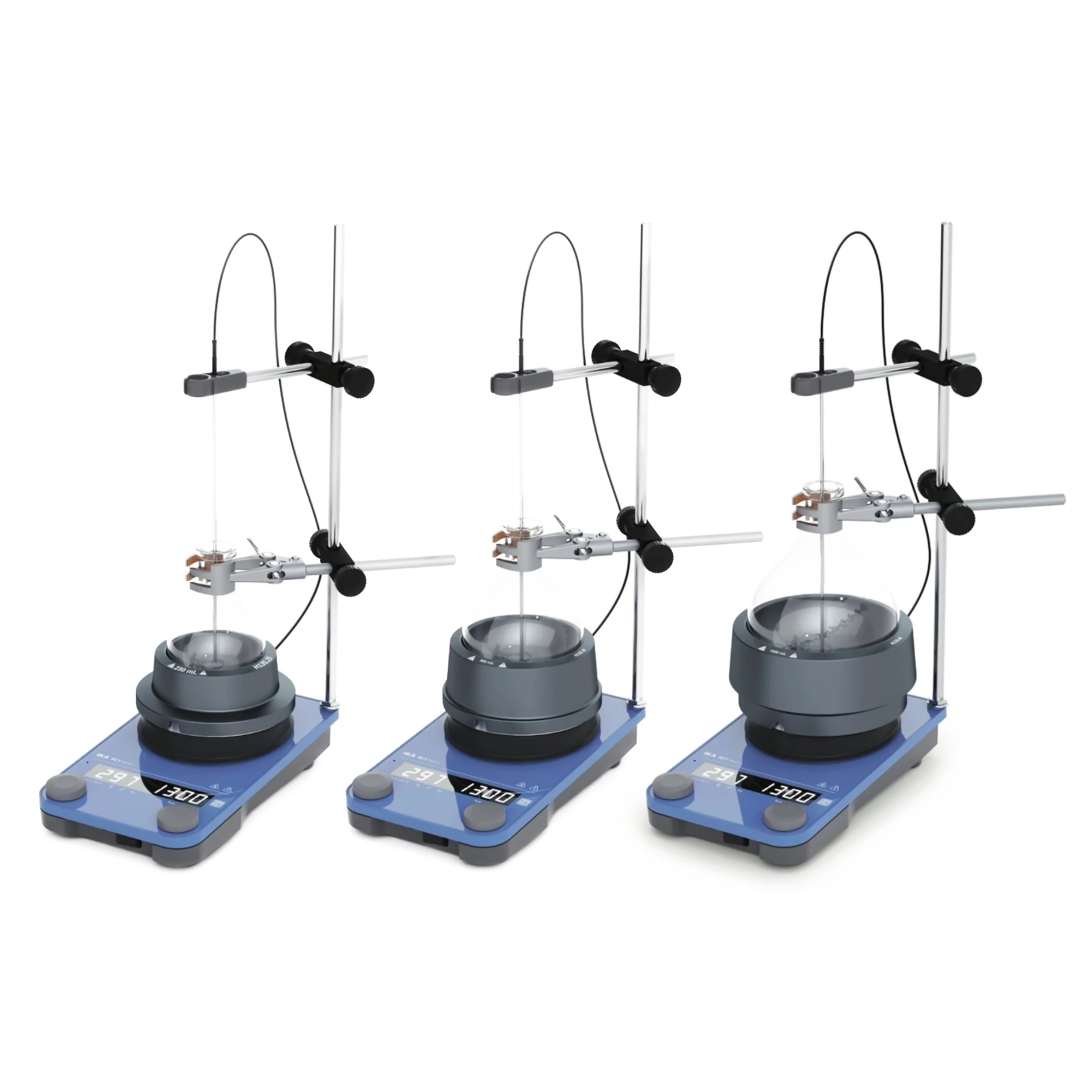 RCT basic Synthesis Solution to nowoczesne mieszadło magnetyczne z funkcją grzania. W ofercie 3 gotowe zestawy z wkładem grzewczym przeznaczonym do kolb o poj. 250ml, 500 ml, bądź 1000 ml (H 135.40), w zależności od wybranego wariantu. Umożliwiają mieszanie cieczy do 20 litrów (H₂O), osiąga temperaturę płyty grzejnej do 310°C. Prędkość obrotowa wynosi 50-1500 obr./min. Dzięki opcji podłączenia zewnętrznego czujnika temperatury umożliwia precyzyjną kontrolę temperatury bezpośrednio w medium reakcyjnym.
