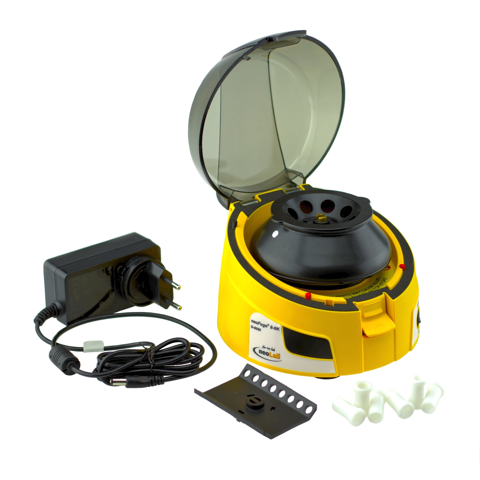 Dostawa obejmuje: wirówkę neoFuge® 8-6K, rotor 8-miejscowy na probówki 1,5/2,0 ml, adaptery do probówek reakcyjnych 0,2 i 0,5 ml oraz dodatkowy rotor na probówki PCR w paskach (2 x 8 miejsc).