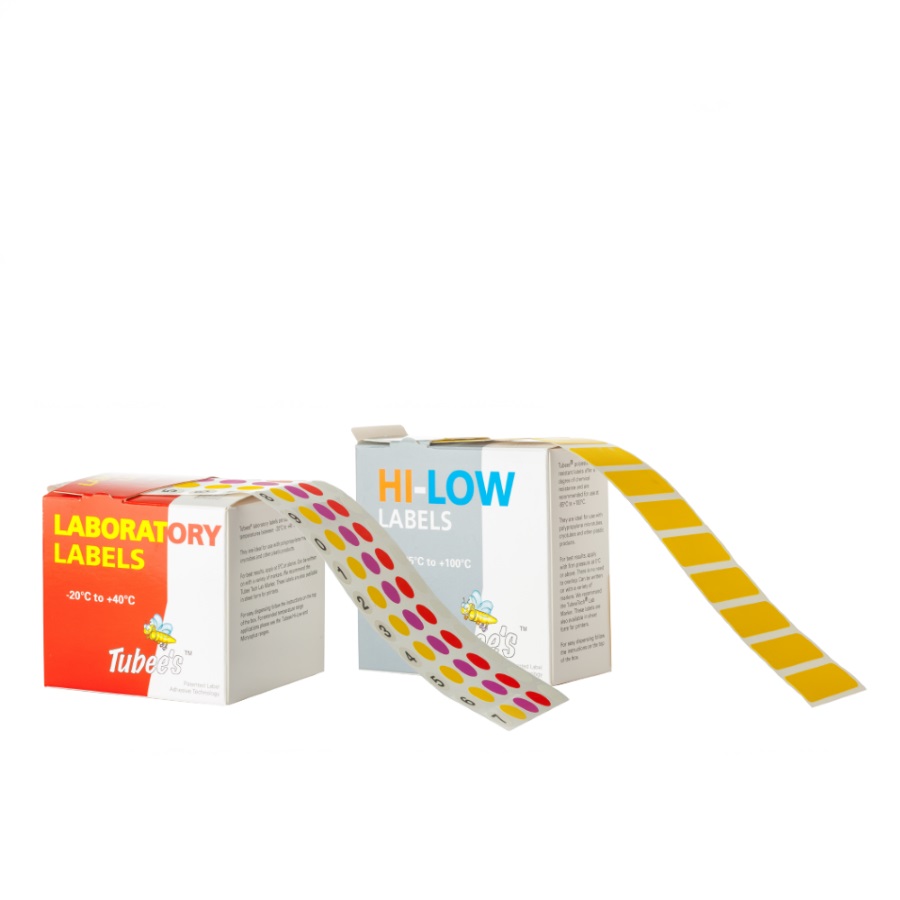 Etykiety przeznaczone do oznaczania probówek, buteleczek i innych małych naczynek. Zakres temperatury: od -20°C do +40°C. Opis możliwy za pomocą różnych pisaków. Dwa rodzaje etykiet: żółte, podłużne dostarczane w kartonie dozującym oraz punktowe na rolce, po 1.000 sztuk w kolorze żółtym, fioletowym, czerwonym, białym oraz białym z cyframi od 0 do 9.