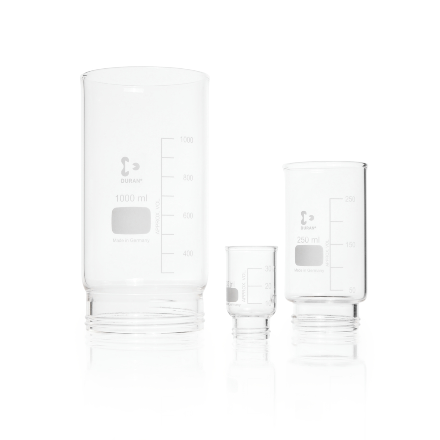 Zapasowe szkalne nasadki z gwintem dedykowane do skręcanych zestawów filtracyjnych Duran. Nasadka, lejek z polipropylenu, 2 uszczelki z FKM oraz spiekany dysk lub krążek perforowany tworzą zestaw. Do krążka G-2961 należy dobrać odpowiedni filtr membranowy lub bibułowy. W przypadku dysków spiekanych jest to opcjonalne. Taki zestaw można połączyć z kolbą próżniową za pomocą uszczelki Guko.