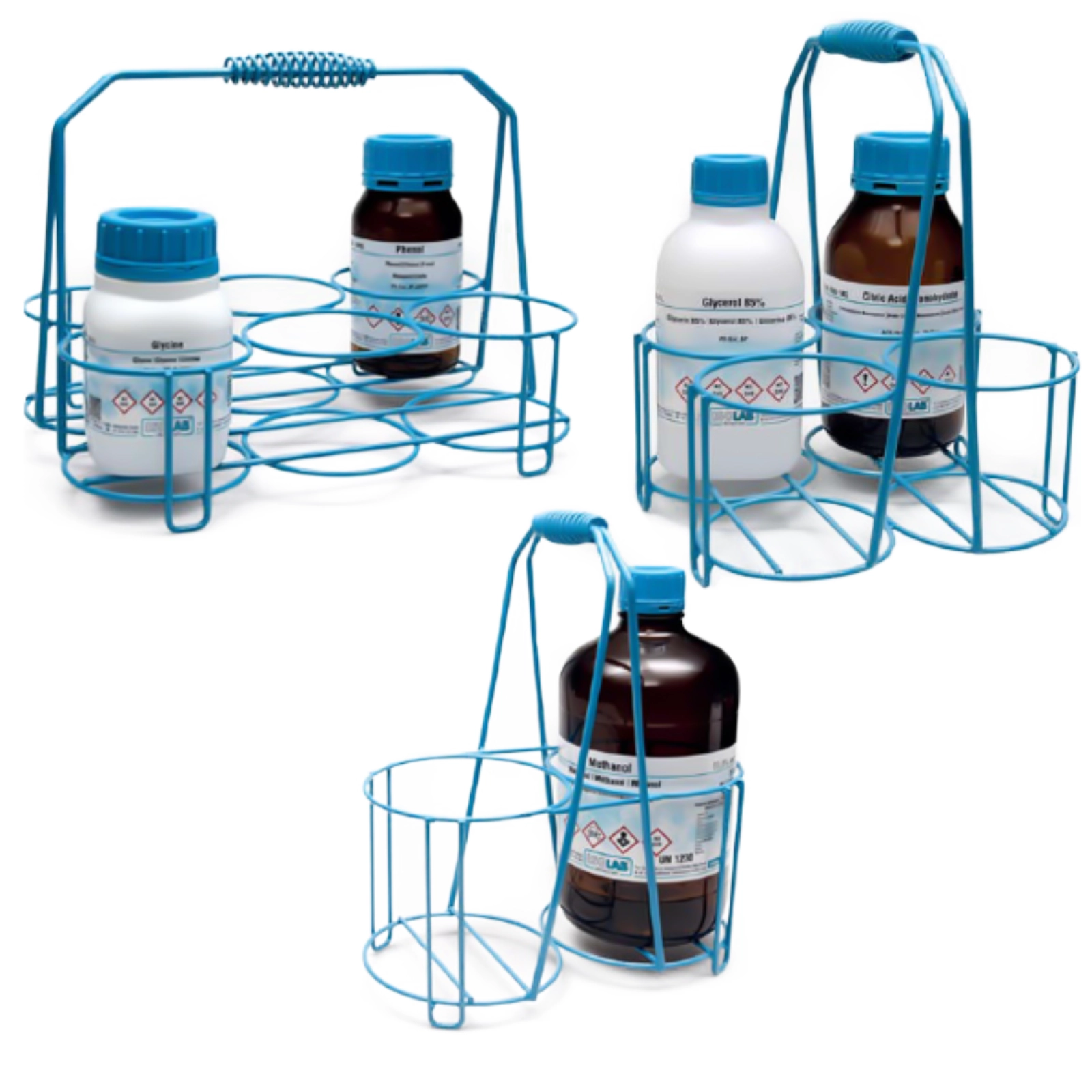 Nosidła na butelki wykonane z powlekanego żywicą epoksydową drutu stalowego. Służą do bezpiecznego transportu standardowych butelek z odczynnikami. Posiadają łatwą do uchwycenia, wytrzymałą rączkę zapewniającą doskonałą równowagę i komfort podczas użytkowania. Oferowane w trzech wariantach – dla butelek o pojemności 500 ml, 1000 ml i 2500 ml.