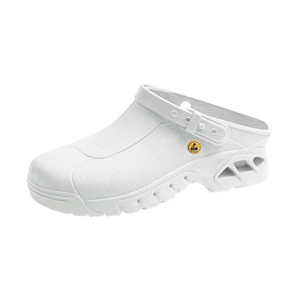 Obuwie ochronne. Dostępne w trzech kolorach. Przeznaczone do użytku w laboratoriach przemysłu farmaceutycznego, spożywczego lub na salach operacyjnych. Zgodne z normami CE, EN ISO 20347:2007. Wykonane ze specjalnego materiału, który może być autoklawowany w temp. 121°C, sterylizowany i dezynfekowany oraz prany w 60°C. Pasek z możliwością zakładania na piętę. Antypoślizgowa podeszwa. Zgodne z ESD według DIN EN 61340.