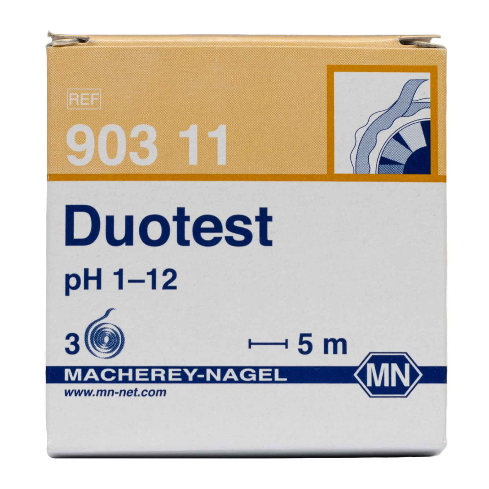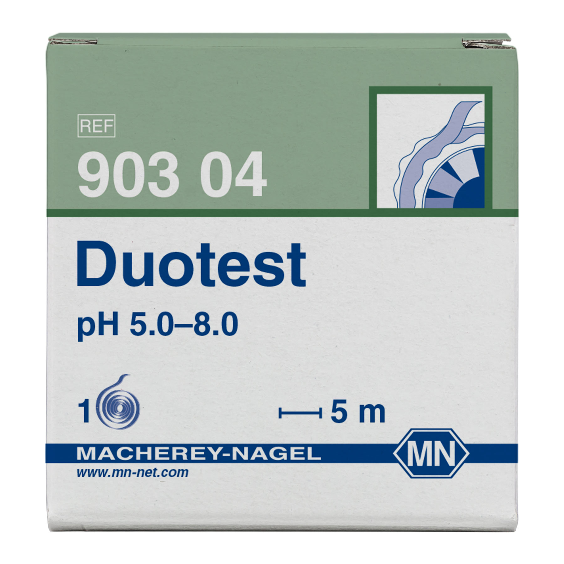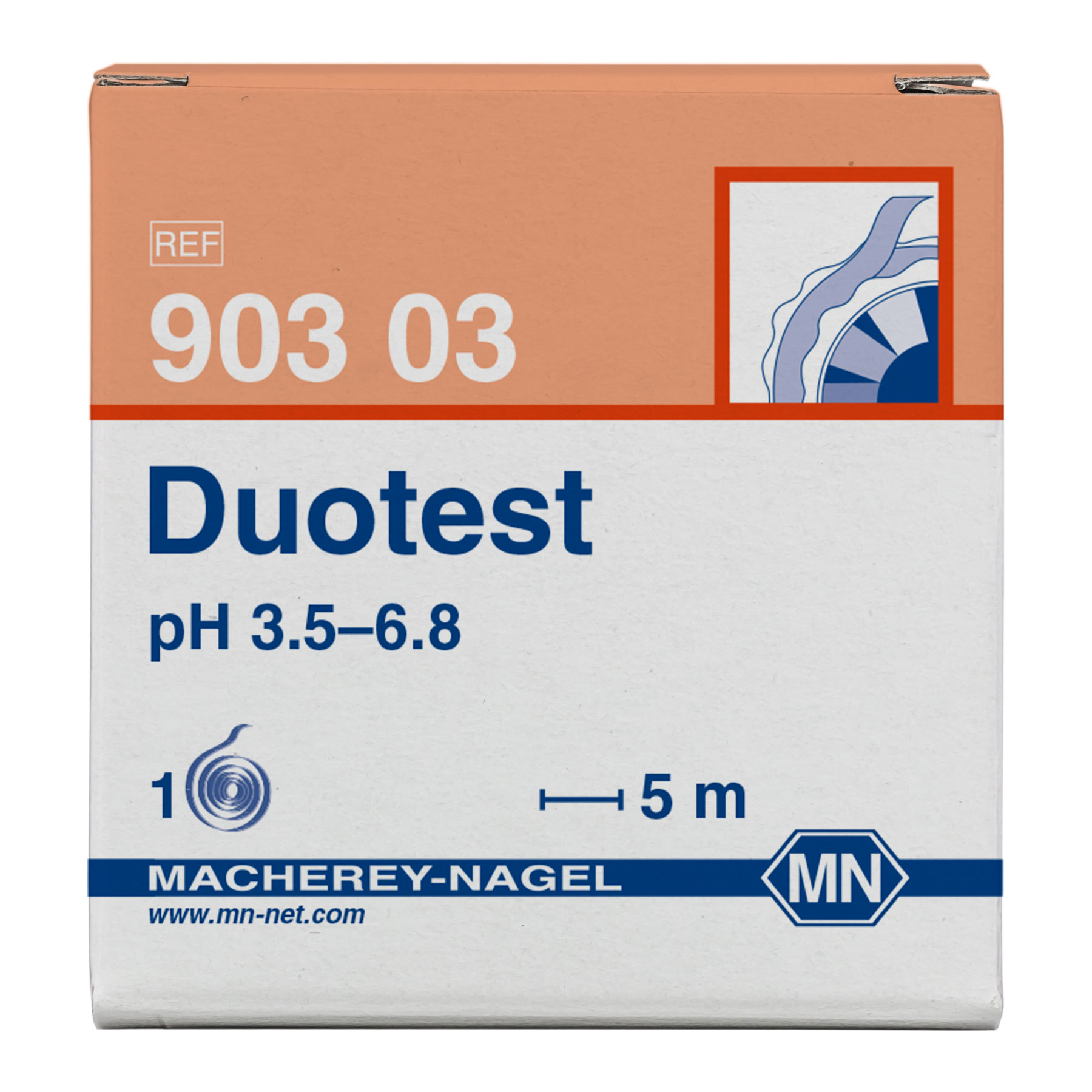 Papierki do pomiaru pH z dwoma różnymi strefami wskaźnikowymi, oddzielonymi barierą hydrofobową. Ułatwiają prawidłowy odczyt pH roztworu i zwiększają dokładność pomiaru. Dostarczane w rolkach po 5 m. Dostępne są również opakowania uzupełniające, zawierające po 3 rolki pasków Duotest.