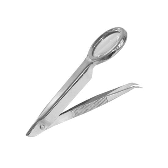 Pinceta z lupą przeznaczona do prac wymagających dużej precyzji. Wykonana ze stali szlachetnej. Posiada zagięte końcówki i rowkowane uchwyty. Możliwa regulacja odległości między końcówkami a soczewką.