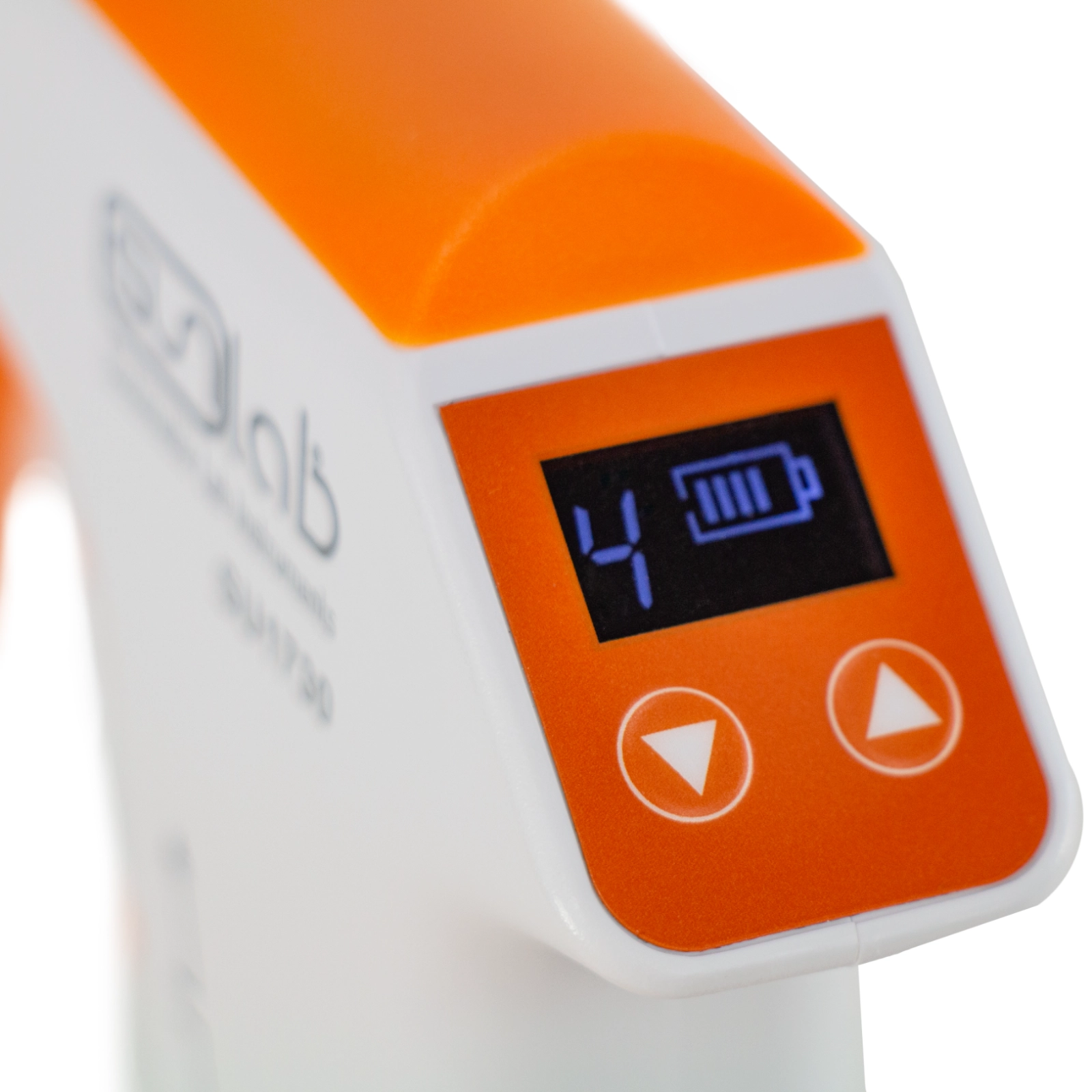 Pipetor SunLab® SU1730 umożliwia bezpieczne pipetowanie z zachowaniem pełnej kontroli. Stanowi doskonałą alternatywę dla gruszki czy pompki do pipet. Sprawia, że pipetowanie seryjne standardowymi pipetami miarowymi staje się wygodne, łatwe oraz wydajne. Urządzenie wykonane z ABS (akrylonitryl-butadien-styren) posiada wyświetlacz LCD. Na ekranie pokazana jest aktualna prędkość i stan baterii. Poniżej znajdują się dwa przyciski do ustawiania mocy cichego silnika o wysokiej wydajności. Prędkość można regulować w zakresie od 1 do 6. Dwa przyciski na ergonomiczne ukształtowanym uchwycie sterują pobieraniem oraz dozowaniem cieczy.
