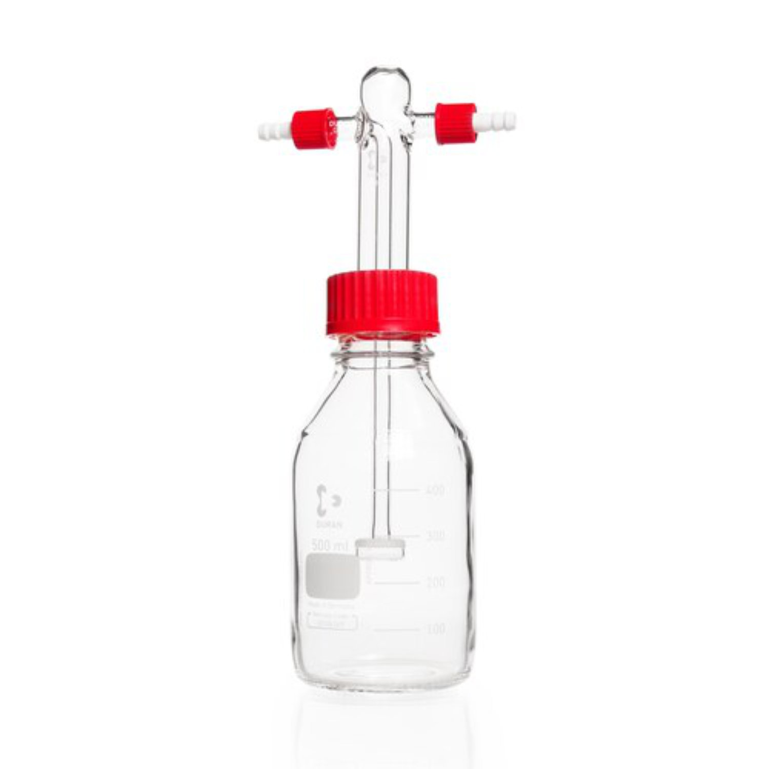 Płuczka do gazów wg Drechsela z butelką GL45 o poj. 500 ml. Wykonana ze szkła borokrzemowego Duran. Dostępne są 2 wersje płuczki: bez dysku spiekanego lub ze spiekiem o porowatości 1. Wyposażona w 2 porty z gwintami GL14 i oliwkami do podłączenia węży o śr. wewn. 8 mm. Wysokość nasadki w płuczce może być regulowana w zależności od potrzeb.