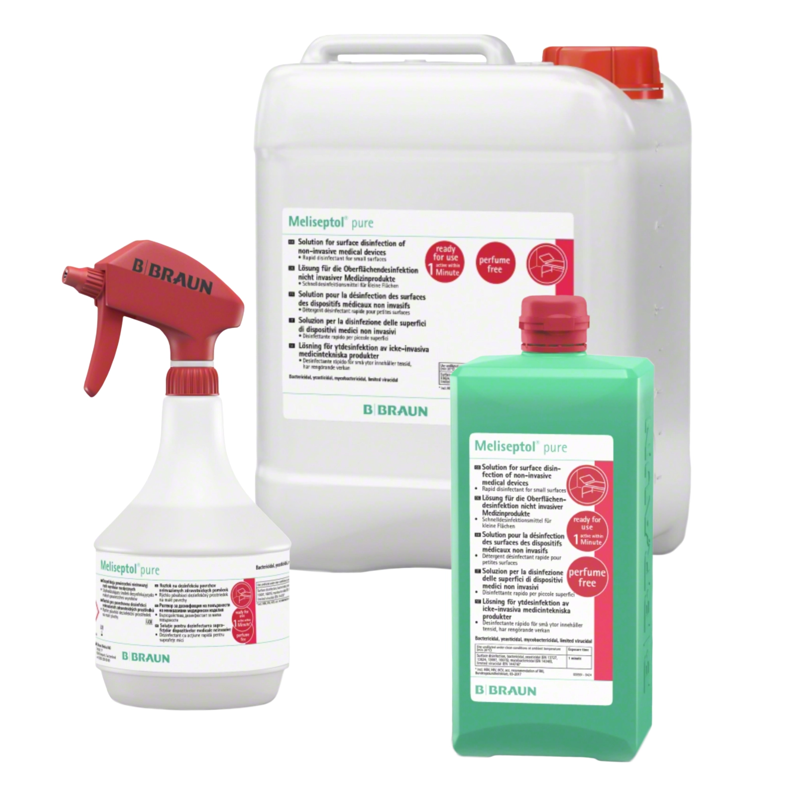 Meliseptol® Pure jest odpowiedni do odkażania wszystkich odpornych na alkohole powierzchni i materiałów. Nadaje się do dezynfekcji urządzeń medycznych i laboratoryjnych, a także sprzętu i narzędzi. Preparat jest gotowy do bezpośredniego użycia. Sprawdzi się do odkażania trudno dostępnych powierzchni. Czas działania wynosi 1 min.