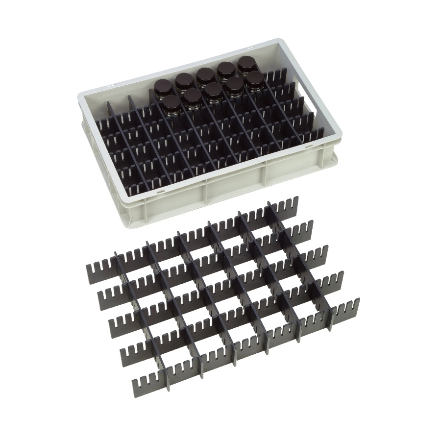 Pojemnik do transportu i przechowywania wykonany z szarego polipropylenu, zamknięty od spodu i po bokach. Z możliwością dowolnego ustawiania w stosy Odpowiada wymaganiom normy europejskiej. Odporny na wiele kwasów i ług. W połączeniu z wkładami stanowi idealny środek transportu dla butelek.