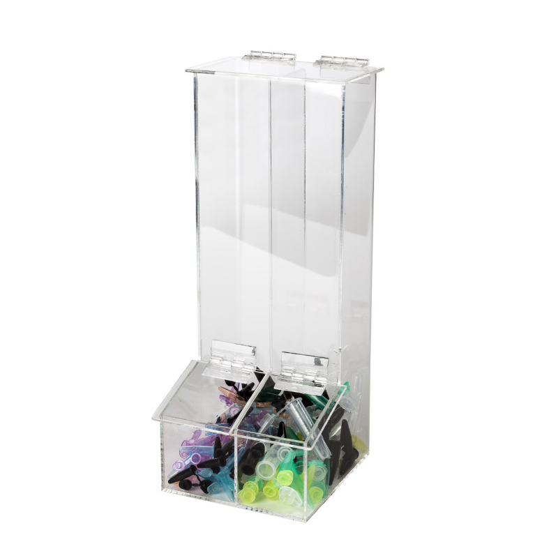 Przeźroczysty pojemnik dozujący na drobny asortyment laboratoryjny np. końcówki do pipet, strzykawki jednorazowe, probówki i inne przedmioty z metalu lub ze szkła. Wykonany z wytrzymałego plastiku akrylowego o gr. 3 mm. Pojemnik napełnia się od góry podnosząc pokrywkę. Przedmioty wyjmowane są z przegródek w części przedniej. Chroni przed zakurzeniem.