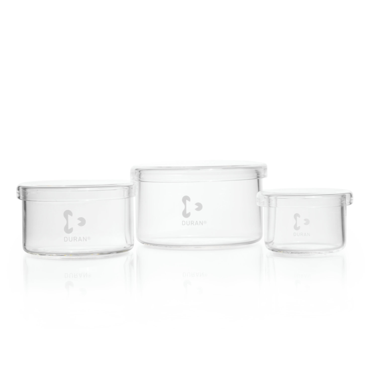 Szklane pojemniki Duran w komplecie z pokrywką. Wykonane ze szkła borokrzemowego. Doskonale do przechowywania i transportu próbek.