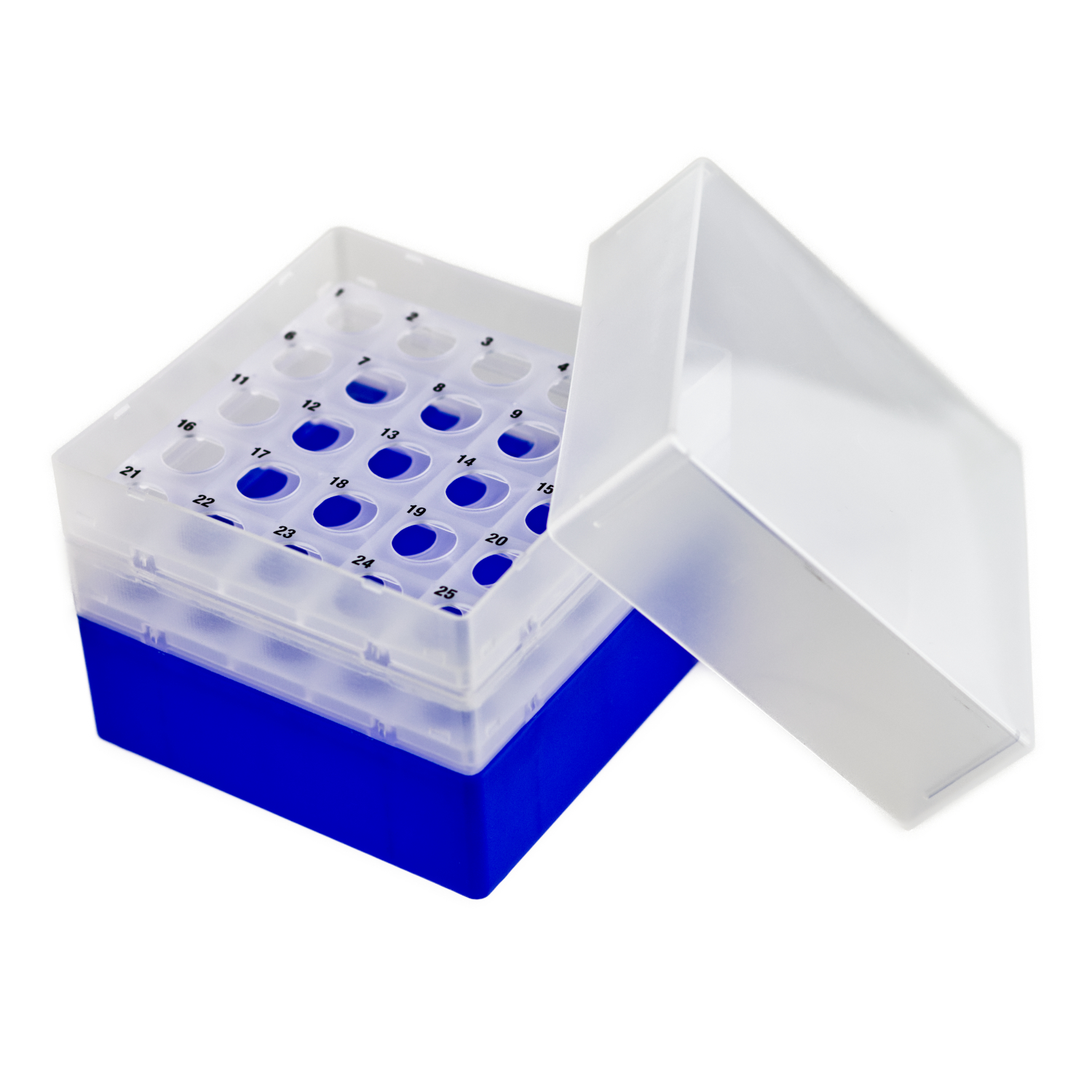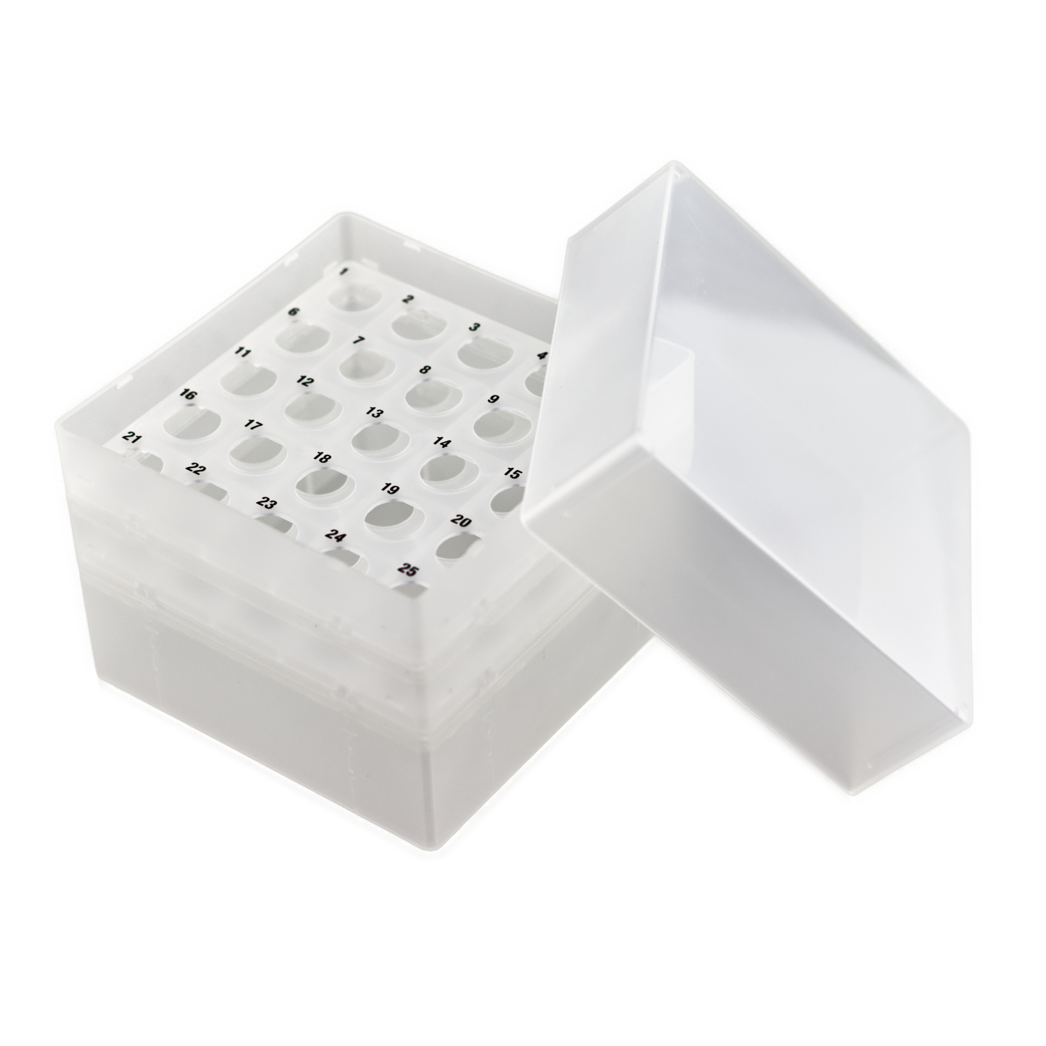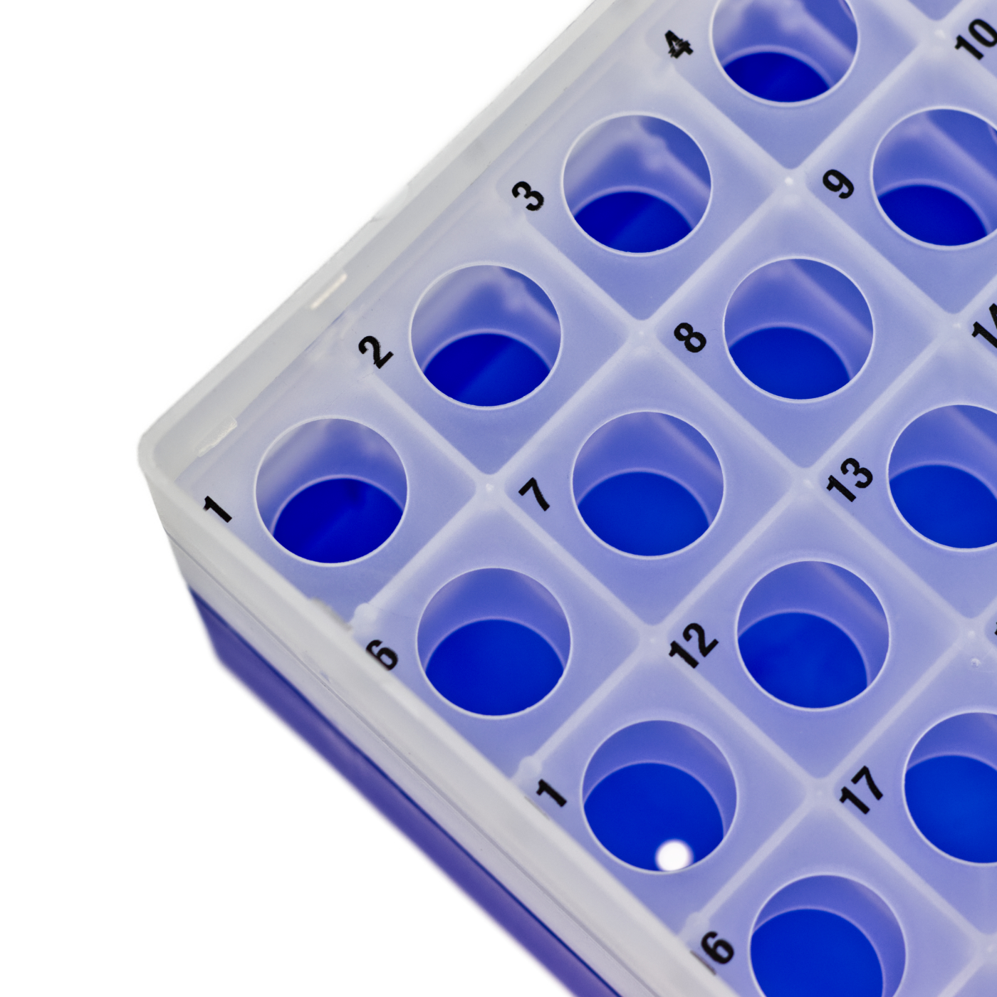 Pudełka na 25 probówek o średnicy do 17 mm (np. Falcony 15 ml). Wykonane z polipropylenu. Z wyraźną numeracją stanowisk 1-25, nadrukowaną na wkładzie na probówki.