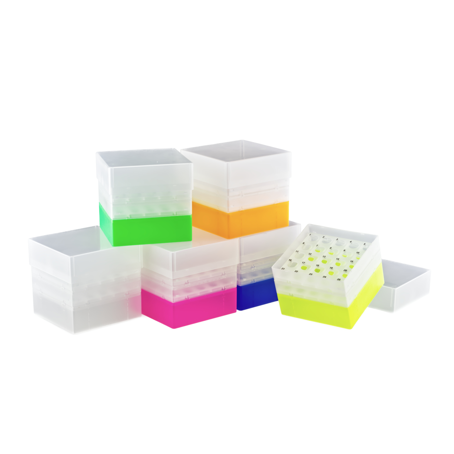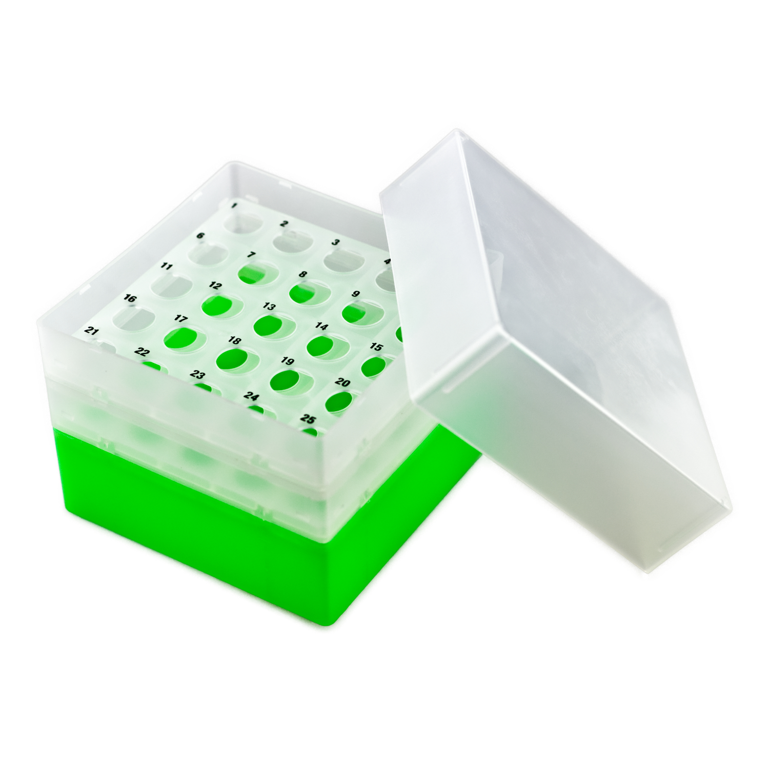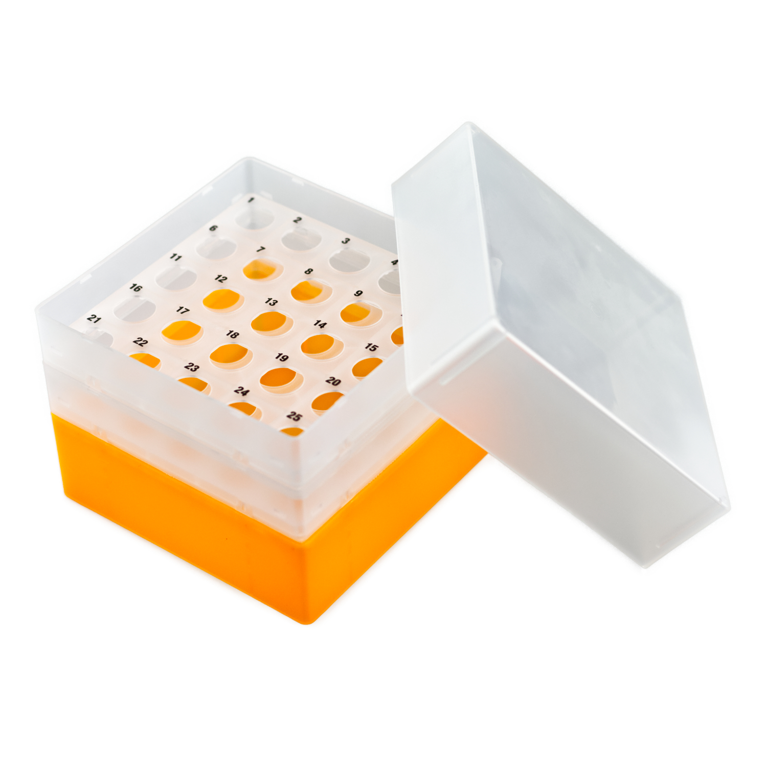 Pudełka na 25 probówek o średnicy do 17 mm (np. Falcony 15 ml). Wykonane z polipropylenu. Z wyraźną numeracją stanowisk 1-25, nadrukowaną na wkładzie na probówki.