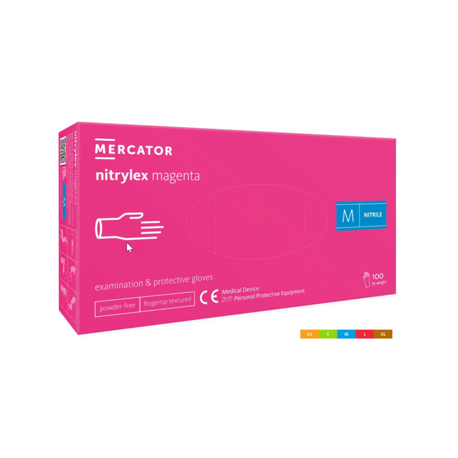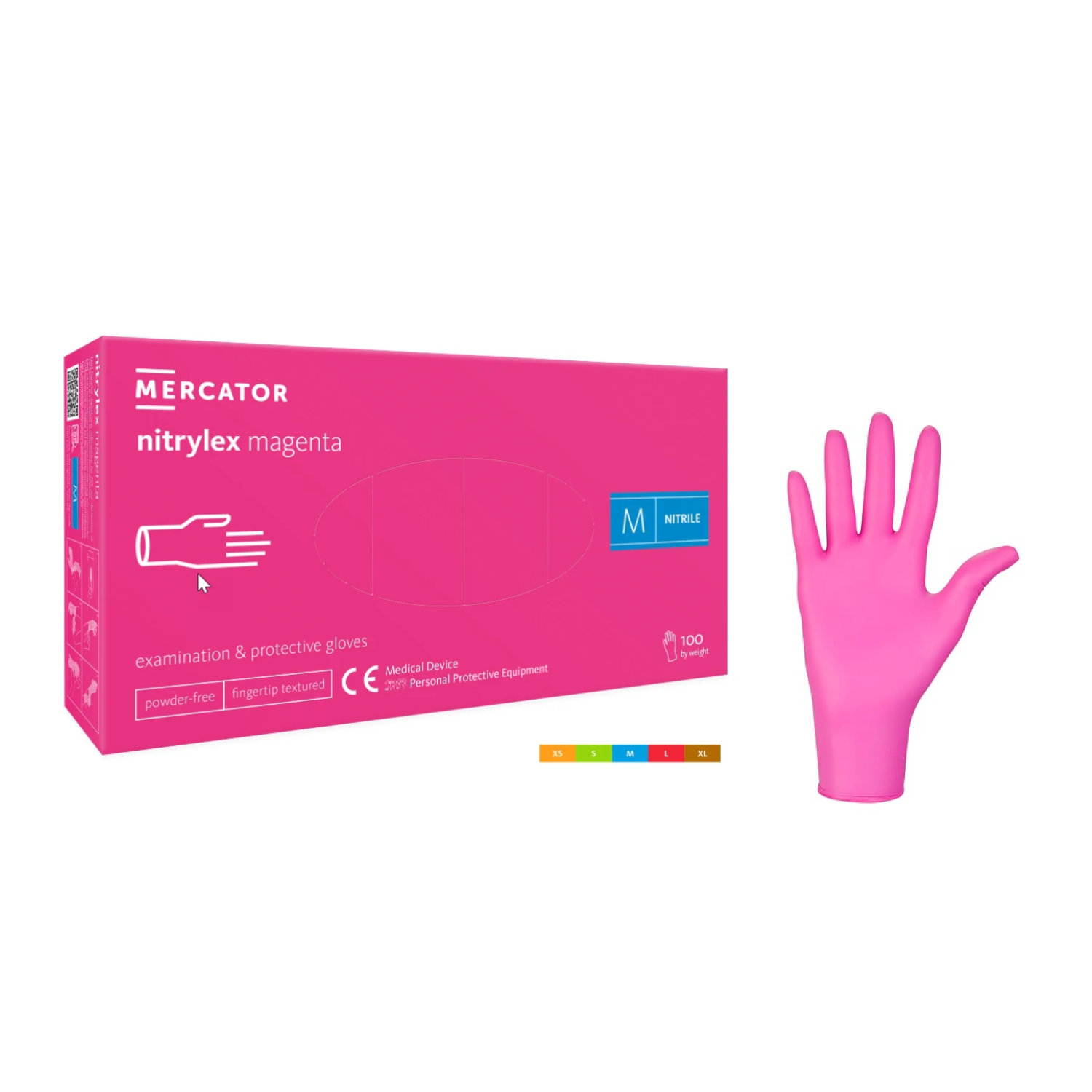 Rękawice nitrylowe nitrylex® magenta wyróżniają się intensywnie różowym kolorem. Pasują na obie dłonie. Mają rolowany mankiet i standardową długość 240 mm. Niesterylne. Dla lepszego chwytu mają teksturowane koniuszki palców. Poziom szczelności AQL zgodnie z normą EN455-1 badanie na nieobecność dziur wynosi 1,5. Opakowanie zawiera 100 sztuk.