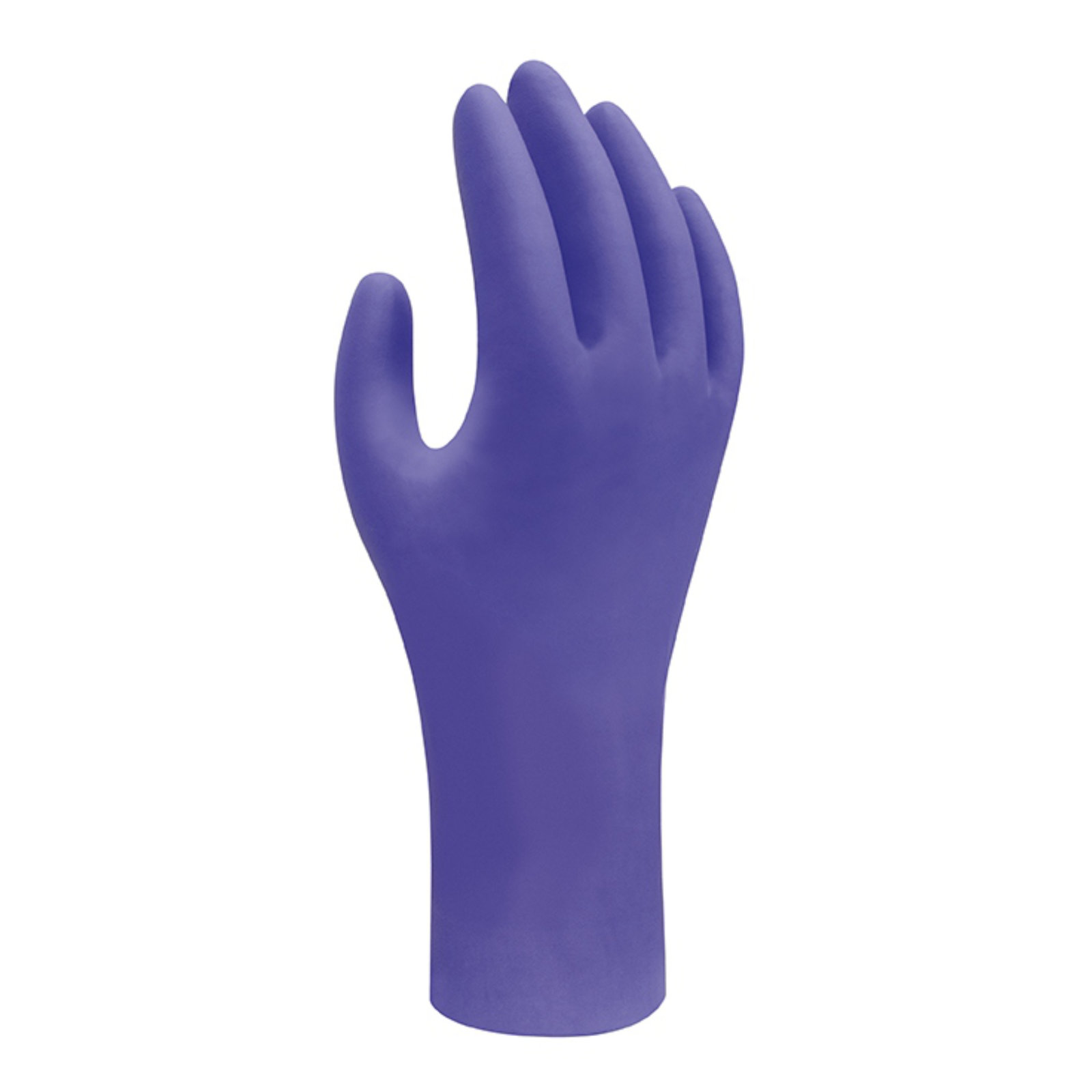 Jednorazowe rękawice Showa 7555 w kolorze kobaltowym są w 100% wykonane z nitrylu. Posiadają wysoką odporność na przenikanie substancji chemicznych oraz przekłucia. Rękawice są bezpudrowe, nie zawierają również alergennego lateksu. Dla zapewnienia wyższego komfortu użytkowania rękawice są chlorowane. Zmniejsza to uczucie lepkości, poprawia chwytność i ułatwia zakładanie. Dodatkowo powierzchnia końców palców jest teksturowana.