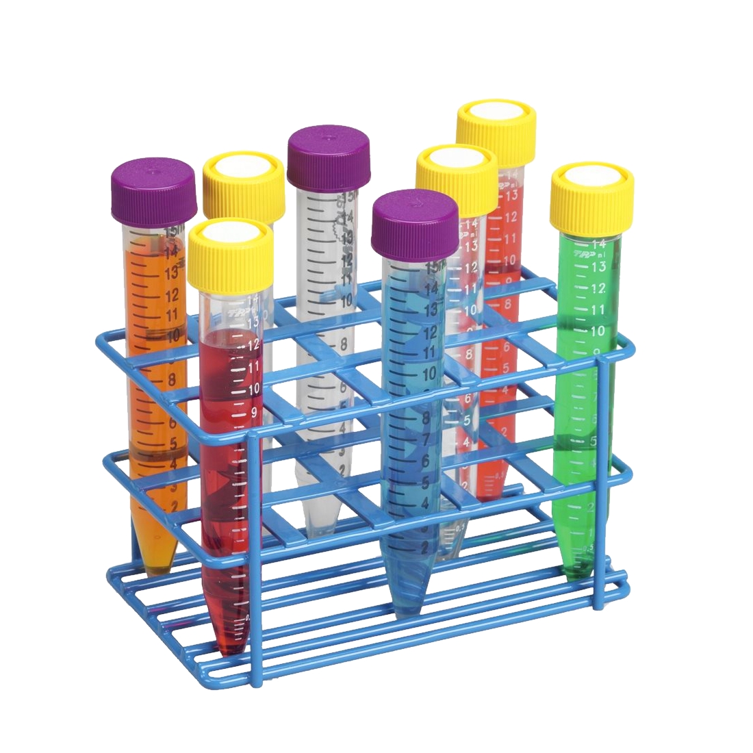 Statyw druciany pokryty powłoką z tworzywa sztucznego w kolorze niebieskim. Odporny chemicznie. Wytrzymały na mrożenie w temperaturze do -40°C. Solidne wykonanie. Idealnie nadaje się do transportu i przenoszenia próbek. Posiada 15 miejsc (3 x 5) na probówki o średnicy do 19 mm (np. typu Falcon). Odpowiedni do stosowania z probówkami stożkowodennymi, okrągłodennymi oraz płaskodennymi. Dodatkowe kratki na spodzie gwarantują bezpieczne ustawienie zwłaszcza probówek stożkowodennych, ale również wszystkich pozostałych. Możliwość autoklawowania.