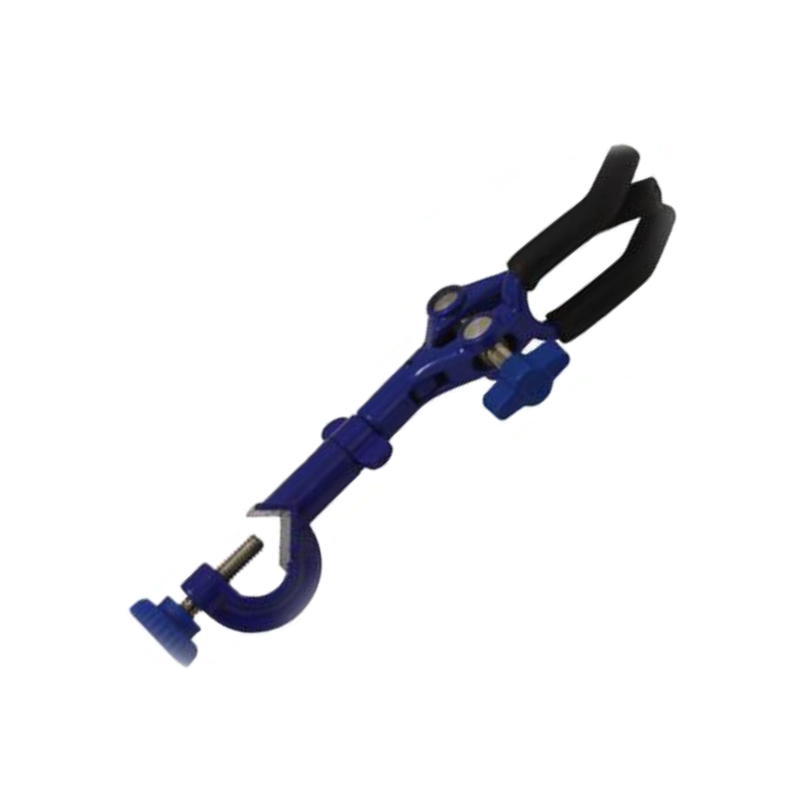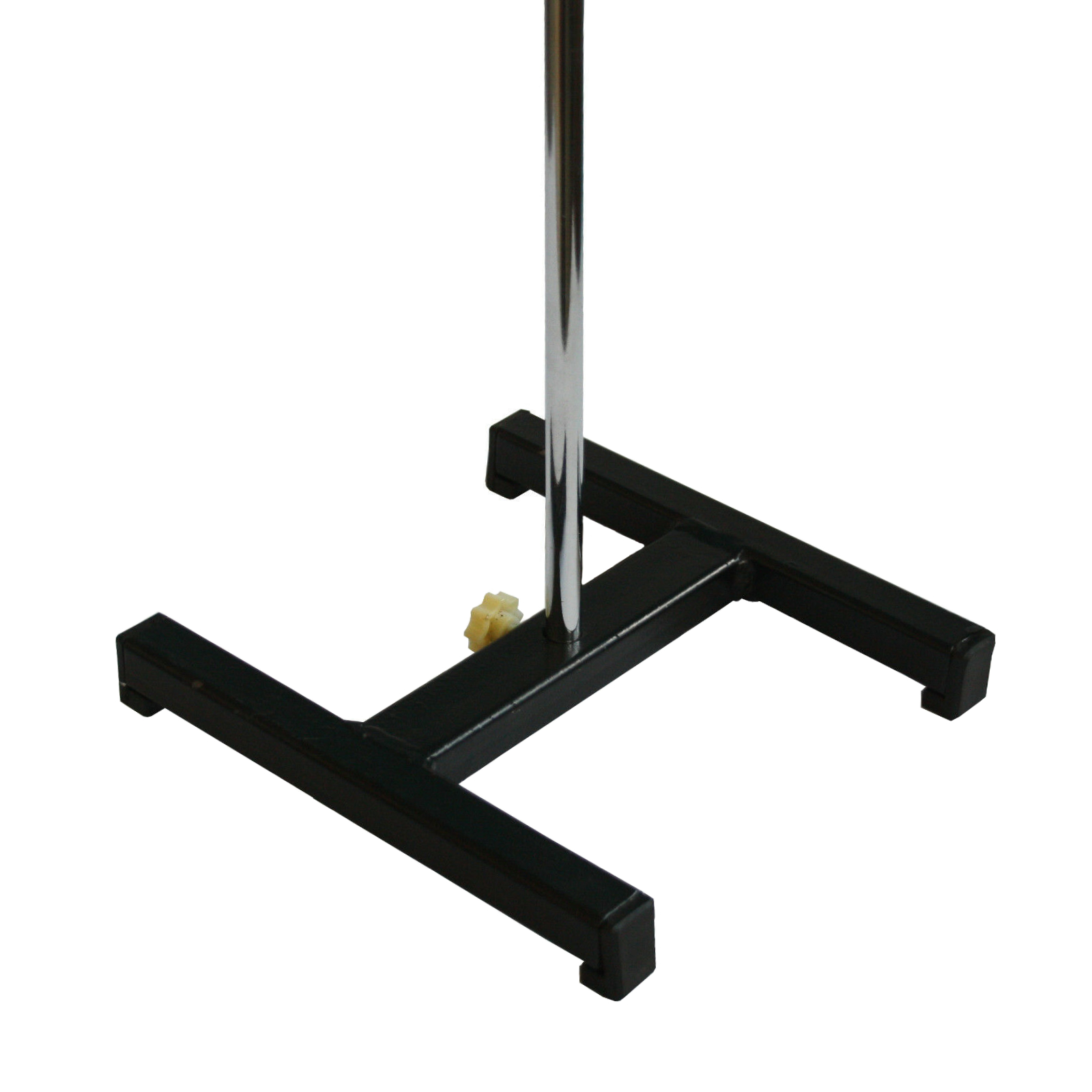 Statyw laboratoryjny wykonany ze stali. Z czarną podstawa w kształcie litery H. Wysokość całkowita 50 cm. Podstawa ma wymiary 21,0 x 20,5 cm i wysokość 2,5 cm. W zestawie znajduje się pręt o średnicy 12 mm i długości 50 cm oraz zacisk z mufą. Ciężar całkowity 1,2 kg.