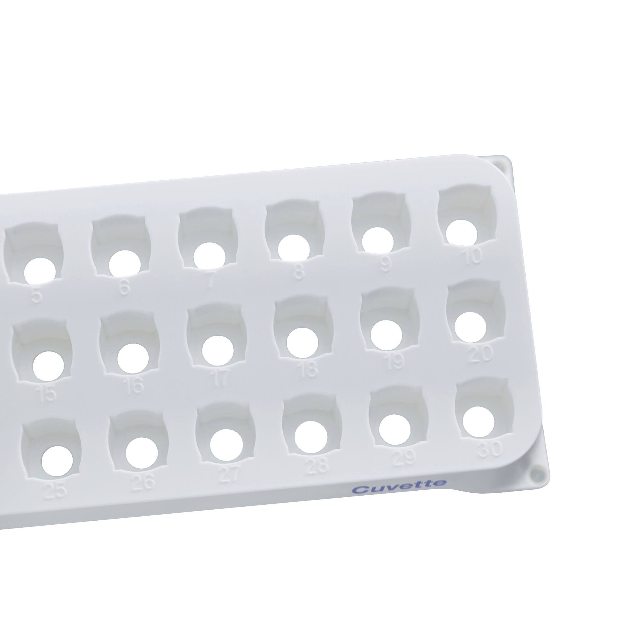 System statywów Eppendorf Cuvette Rack. Kompatybilny ze statywami Tube Rack. Pozwala na jednoczesne przechowywanie 30 kuwet spektrofotometrycznych szklanych lub plastikowych. Dzięki antypoślizgowym nóżkom statywy są stabilne, a próbki bezpieczne. Numeracja stanowisk zapewnia bezbłędną identyfikację. Falista konstrukcja ułatwia dostęp do próbek. Statywy mogą być przechowywane piętrowo, dzięki czemu oszczędza się miejsce potrzebne do ich magazynowania. Wykonane z polipropylenu (PP). Cechują się wysoką odpornością chemiczną i fizyczną. Autoklawowalne.