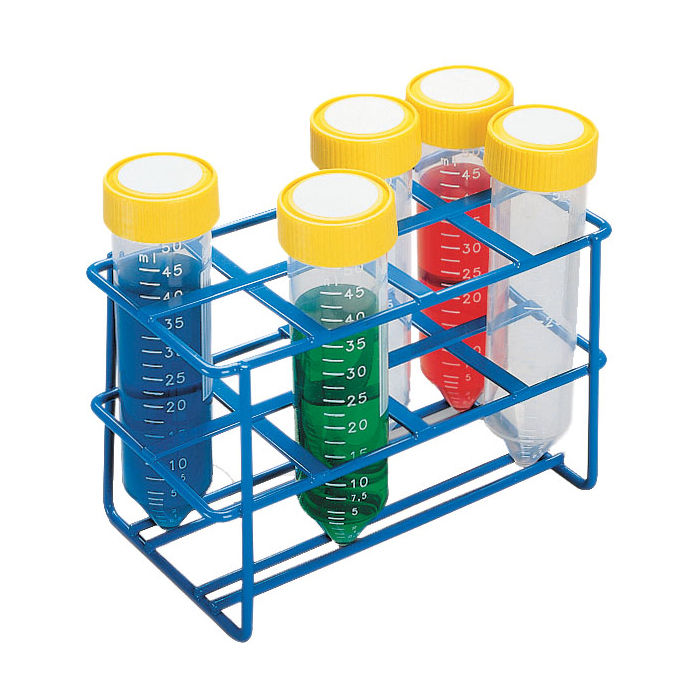 Statyw z drutu przeznaczony na stożkowe probówki wirówkowe „Blue Max” o poj. 50 ml. Pokryty specjalną epoksydową warstwą tworzywa sztucznego. Autoklawowalny.