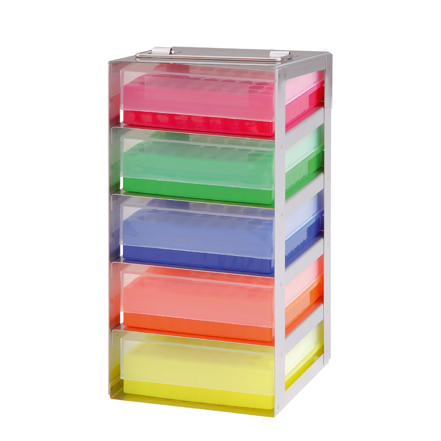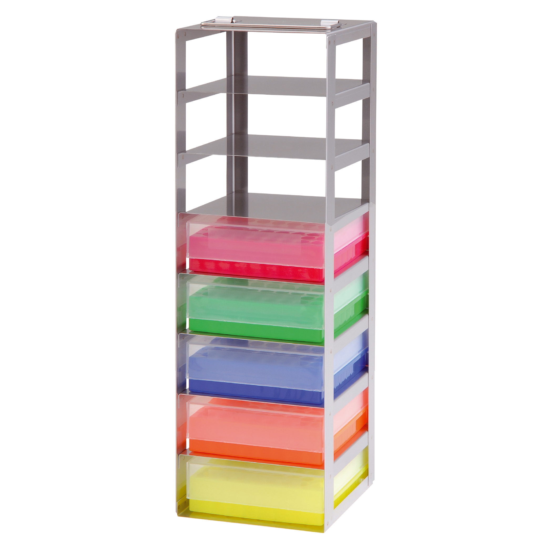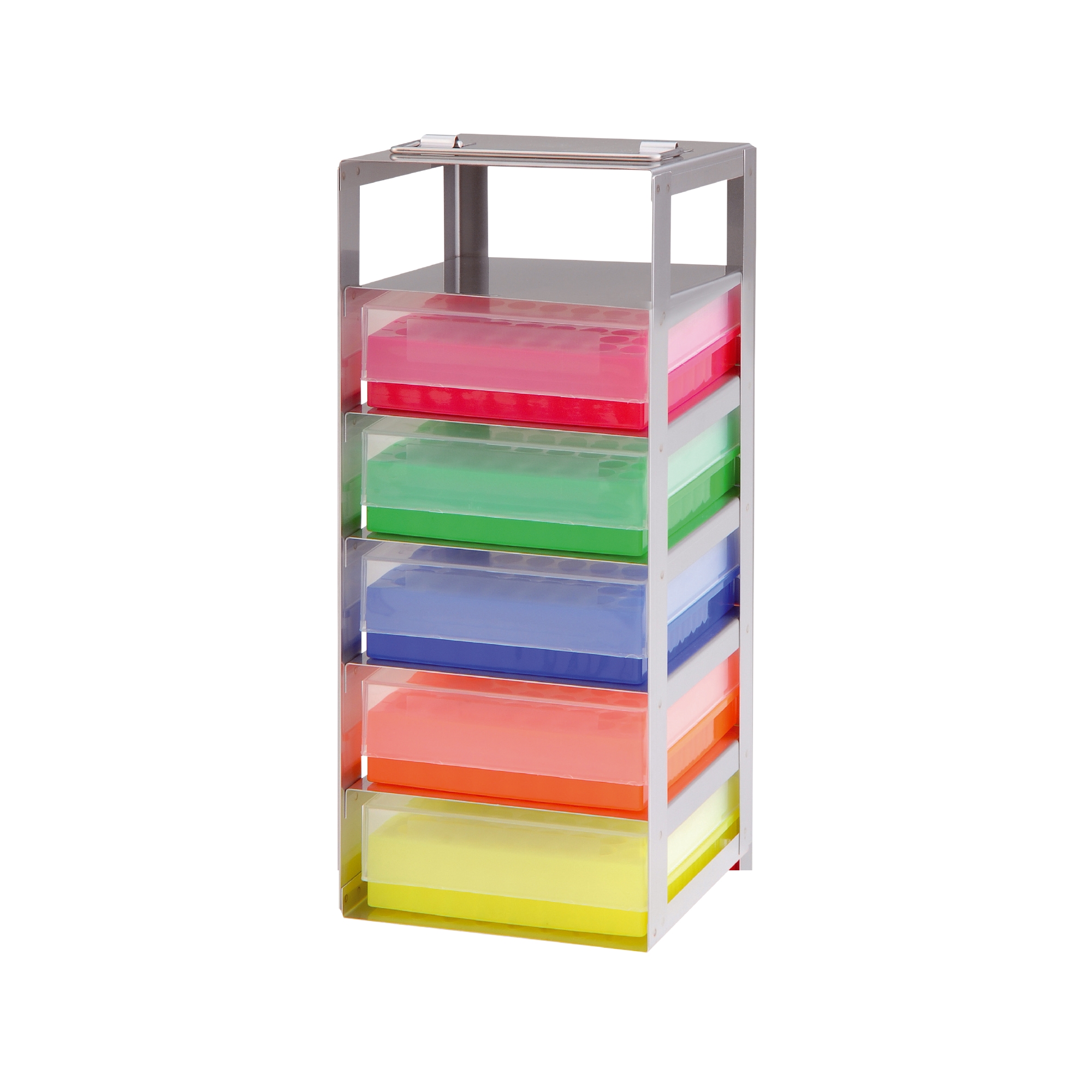 Pionowy stelaż wykonany z wysokiej jakości stali szlachetnej. Ze składanym uchwytem. Przeznaczony do wszystkich kriopudełek o wymiarach zew. 136 x 136 x 53 mm (szer. x gł. x wys.). Przystosowany specjalnie do kartonowych kriopudełek neoLab (Nr-Art. 2-2695 i kolejne).
