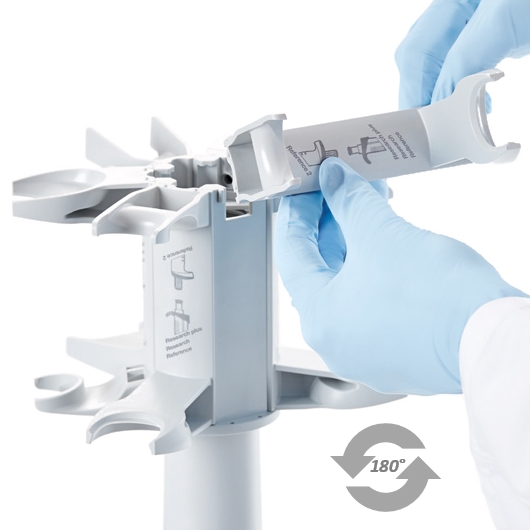 Pipety na statywie przechowywane są bezpiecznie, nie dotykając podłoża, co zapobiega kontaminacjom. Uchwyty do statywu mogą być stosowane zamiennie, a ich montaż jest prosty i nie wymaga dodatkowych narzędzi. Uchwyty na statywie mogą być ustawiane w dwóch orientacjach (obracane o 180 stopni).