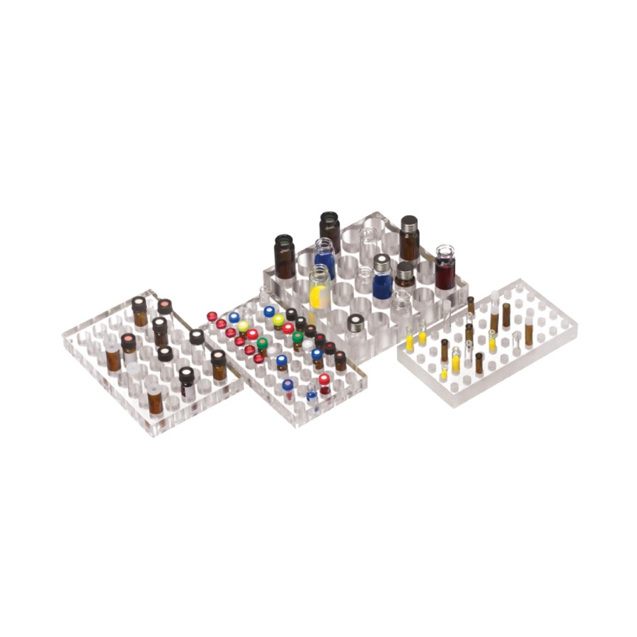 Praktyczne statywy na fiolki. Wykonane z przeźroczystego akrylu. Ułatwiają transport i użytkowanie fiolek. Stabilne. Silikonowe stopki umożliwiają ustawianie w stosy. Statyw na fiolki o Ø 8 i 11 mm nadaje się również do przechowywania fiolek stożkowych.