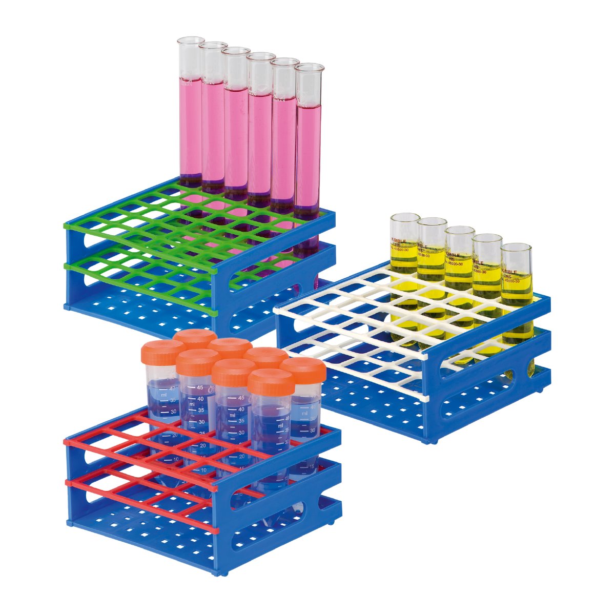 Niedrogie statywy wykonane z polipropylenu. Kwadratowe. Przystosowane do różnych wielkości probówek. Stabilne. Posiadają alfanumeryczne oznaczenia otworów ułatwiające identyfikację próbek. Części boczne i najniższy poziom przy wszystkich rozmiarach są niebieskie. Oba górne poziomy mają różne kolory w zależności od Nr-Art. Możliwość ustawienia piętrowego.