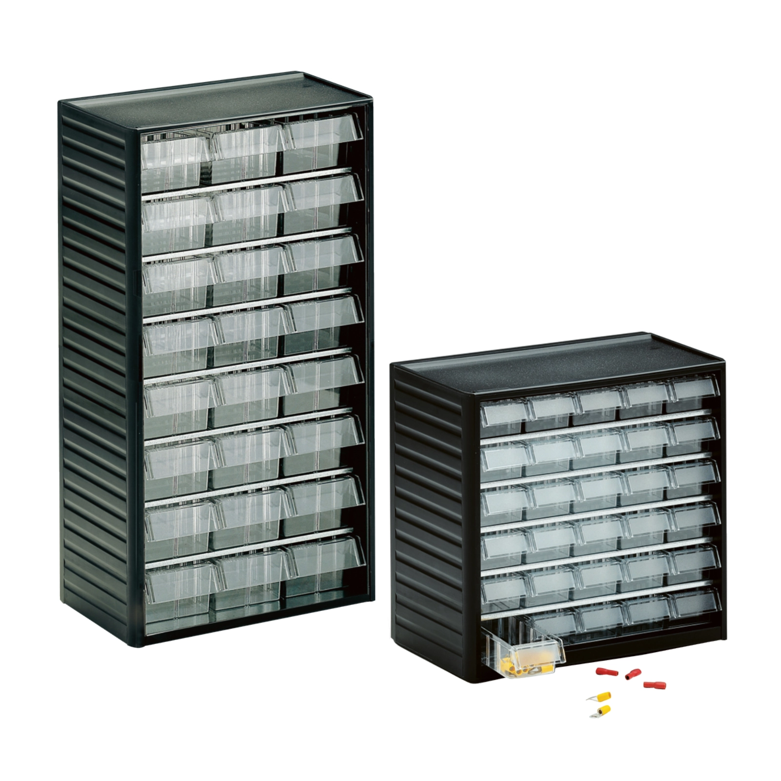 Szafki z obudową z polipropylenu. Mogą być ustawiane pojedynczo lub mocowane na ścianie. Posiadają stabilne stalowe ramy z powłoką proszkową w kolorze jasnoszarym. Szuflady wykonane z bezbarwnego polistyrenu, z dużym uchwytem. Sprawdzą się jako organizer dla małych przedmiotów.