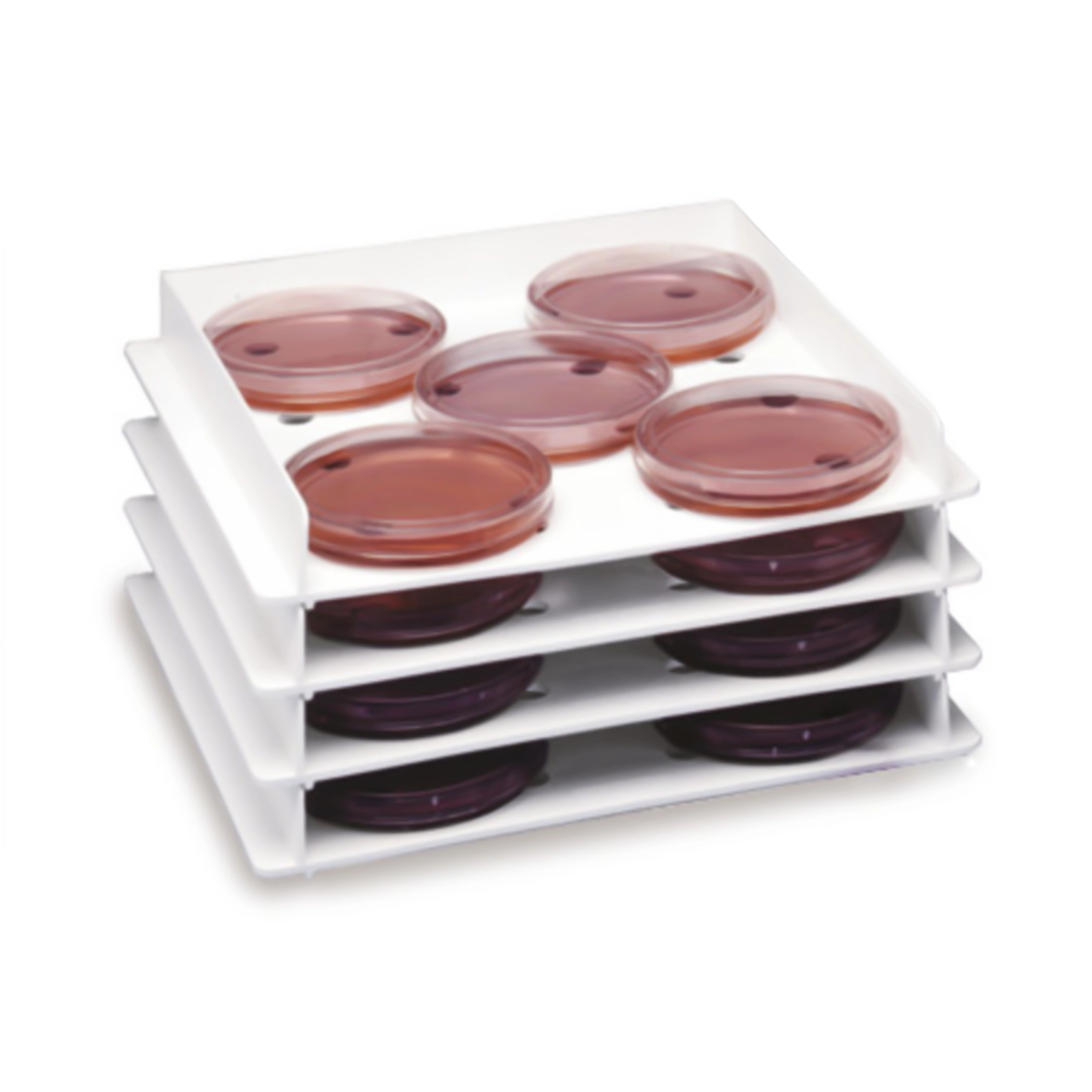 Tacka inkubacyjna na szalki Petriego, wykonana z PP (polipropylenu). Zwiększa całkowitą pojemność inkubatora, ułatwia organizację, umożliwia wygodne przenoszenie szalek Petriego. Powierzchnia tacki mieści 5 szalek Petriego o średnicy 100 mm lub 15 szalek o średnicy 60 mm. 16 otworów wentylacyjnych w dnie stojaka ułatwia przepływ powietrza. Boczne ścianki można wykorzystać do identyfikacji ważnych próbek za pomocą markera lub etykiety.