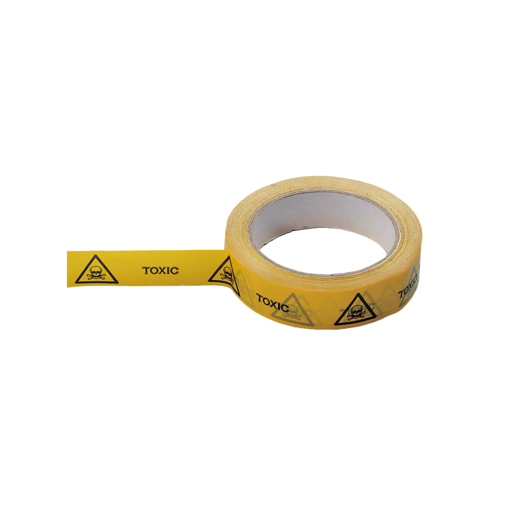Samoprzylepna, żółta taśma z symbolem czaszki i napisem TOXIC.