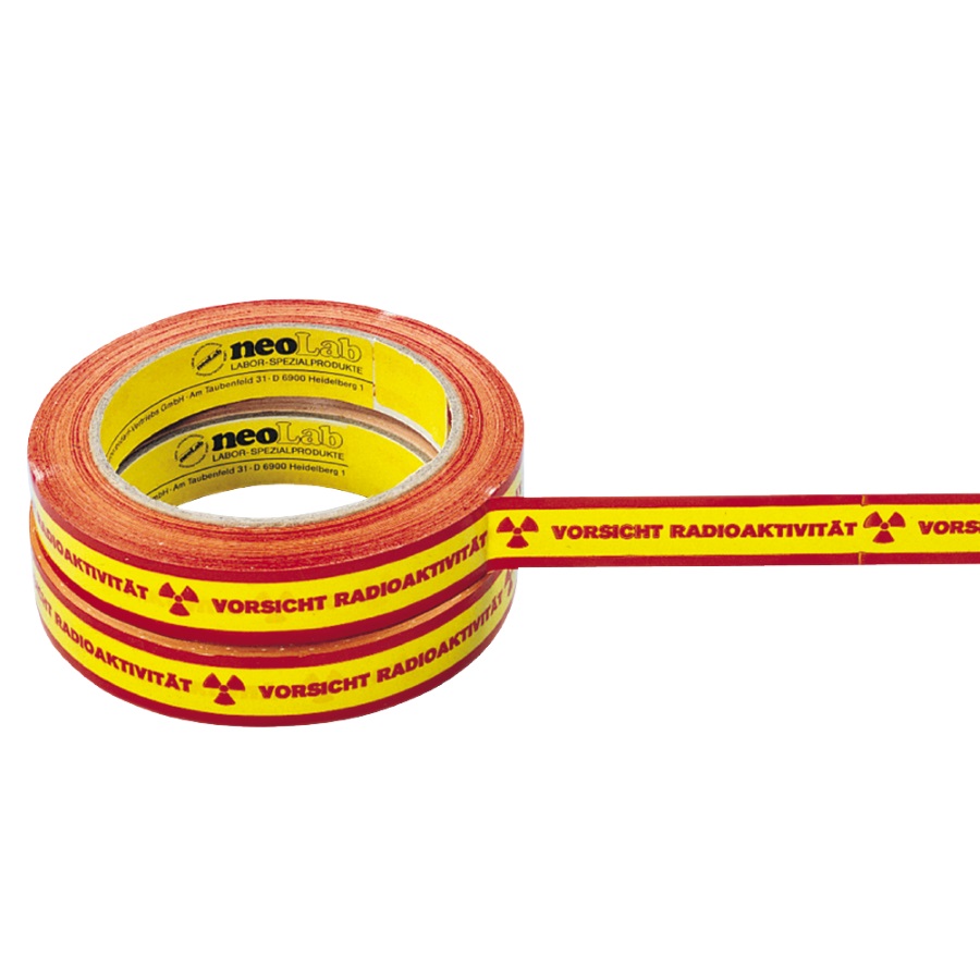 Żółta taśma z czerwonym napisem ostrzegawczym „VORSICHT RADIOAKTIVITÄT”. Napis w języku niemieckim. Doskonała do oznaczania stref zagrożenia, urządzeń i naczyń.