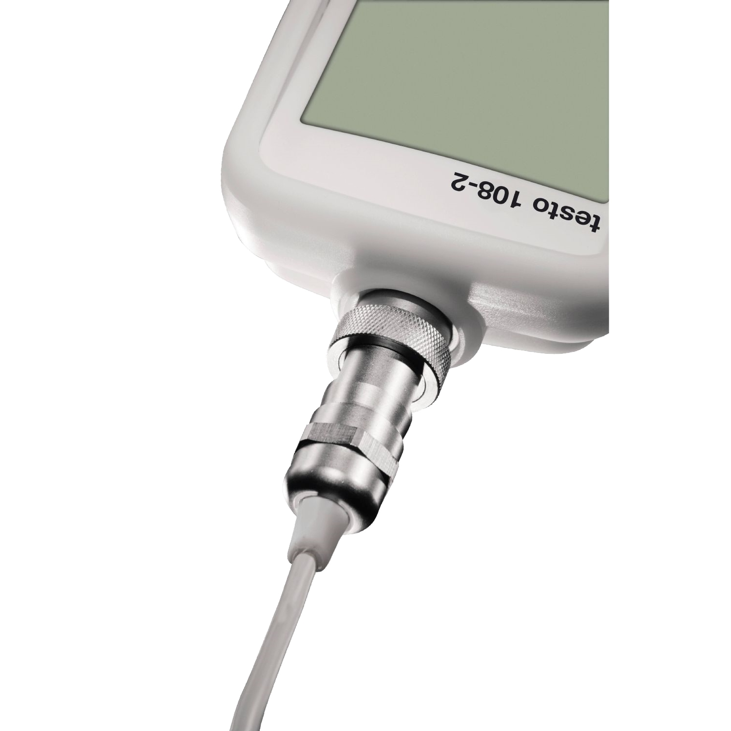 Miernik temperatury Testo 108-2 z przykręcaną sondą zanurzeniową typu T (Cu-CuNi) pozwala na wykonywanie pomiarów punktowych co 0,5 s z dokładnością do ±0,5°C. Urządzenie jest wodoodporne (klasa ochrony IP67) i mierzy temperaturę w zakresie od -50 do +300°C . Termometr jest łatwy w obsłudze dzięki 2 ergonomicznym przyciskom, stabilnie mocowanej sondzie z możliwością złożenia i dużemu wyświetlaczowi LCD. Wyposażony jest również w funkcje auto hold, hold oraz min/max. Jest zgodny z HACCP i normą EN 13485.