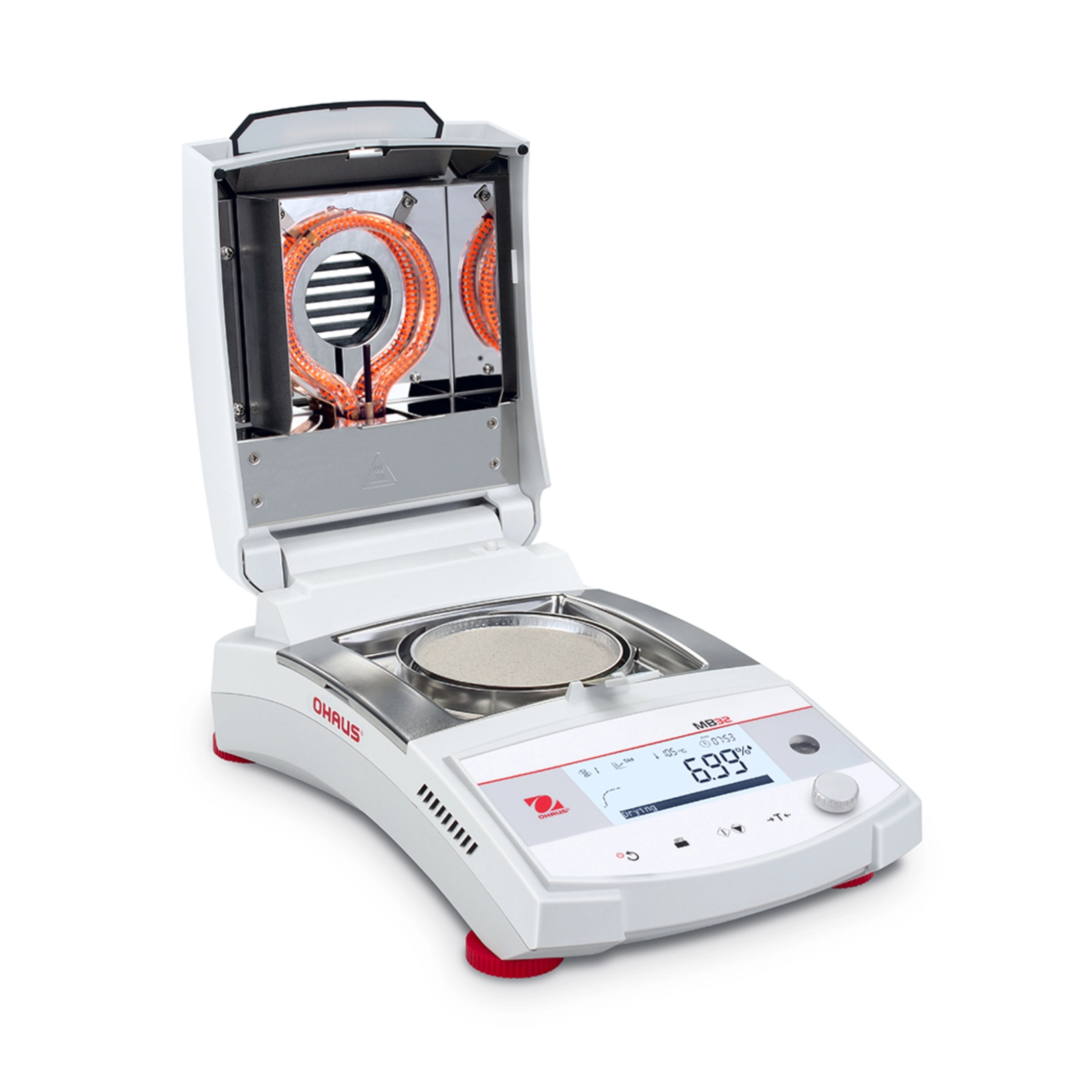 Wagosuszarka MB32 sprawdzi się do oznaczania zawartości wilgoci praktycznie każdego rodzaju materiału. Początkowo urządzenie dokonuje pomiaru wagi próbki, kolejno jest ona podgrzewana przez lampę z włókna węglowego, co indukuje parowanie wody z badanego materiału. W międzyczasie wagosuszarka stale określa wagę próbki i wyświetla jej wartość. Końcowo urządzenie przedstawia wyniki jako % lub wagę suchej masy, % wilgotności oraz stosunek wilgotności do suchej masy.