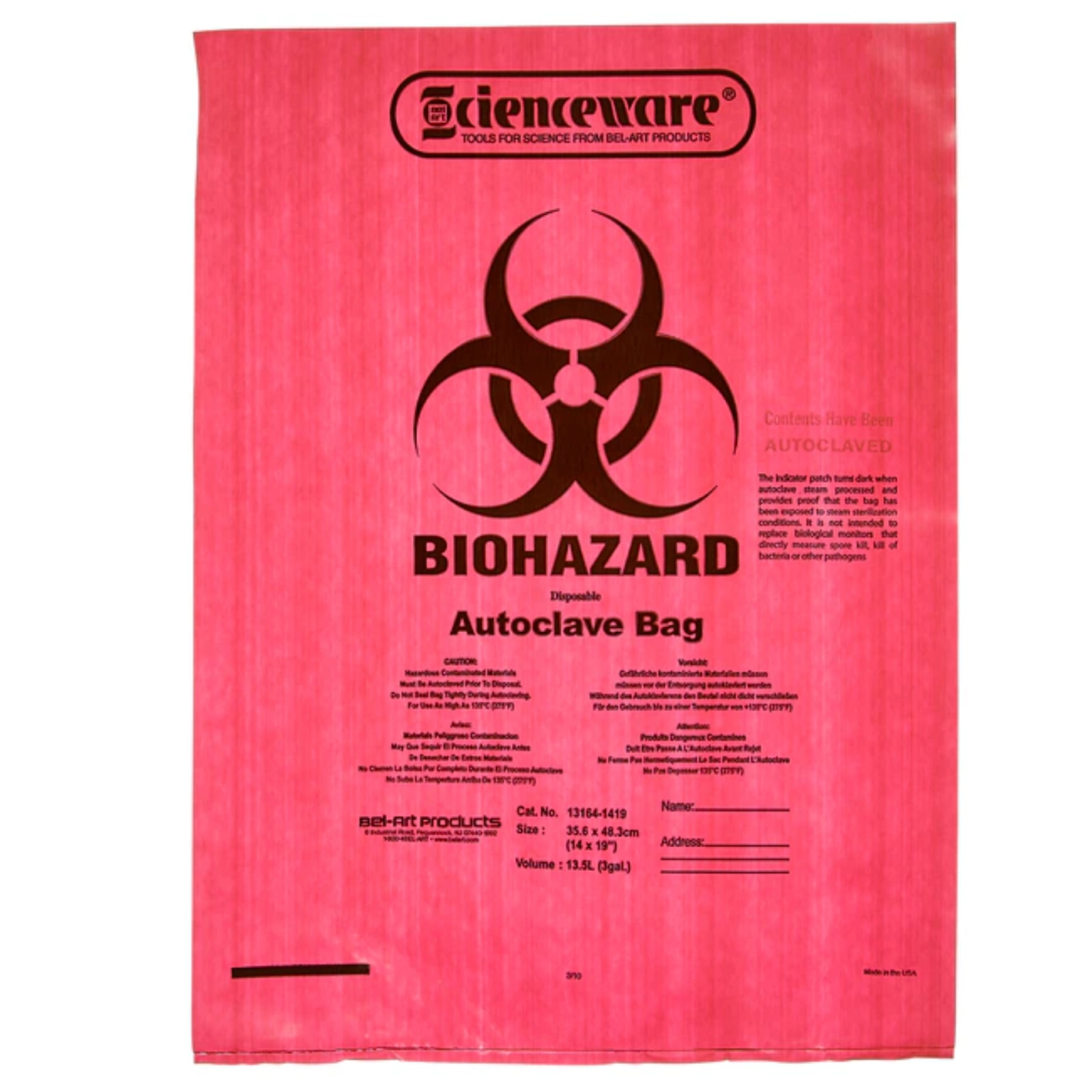Czerwone worki na odpady z nadrukiem „BIOHAZARD” oraz instrukcją bezpieczeństwa w 4 językach. Ścianki o grubości 38 µm wykonane z polipropylenu stanowią skuteczną barierę dla substancji niebezpiecznych. Dodatkowo producent wyposażył produkt we wskaźnik sterylizacji ciemniejący pod wpływem temperatury. Autoklawowalne w temperaturze do 135°C. Pakowane po 200 sztuk (największy rozmiar po 100 sztuk).