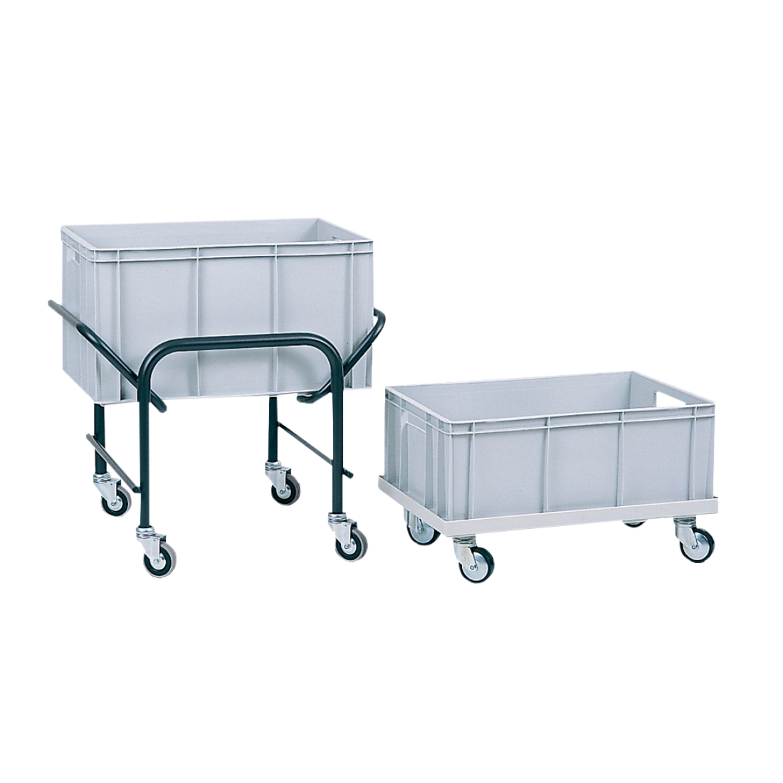 Wózek przydatny do przewożenia wanien, koszy i innych pojemników (600 x 400 mm). Wyposażony w 4 kółka sterujące z gumowymi obręczami. Wózki dostarczane są bez pojemników. Pasujące do wózka pojemniki dostępne są pod numerami art. od 2-1144 do 2-1147.