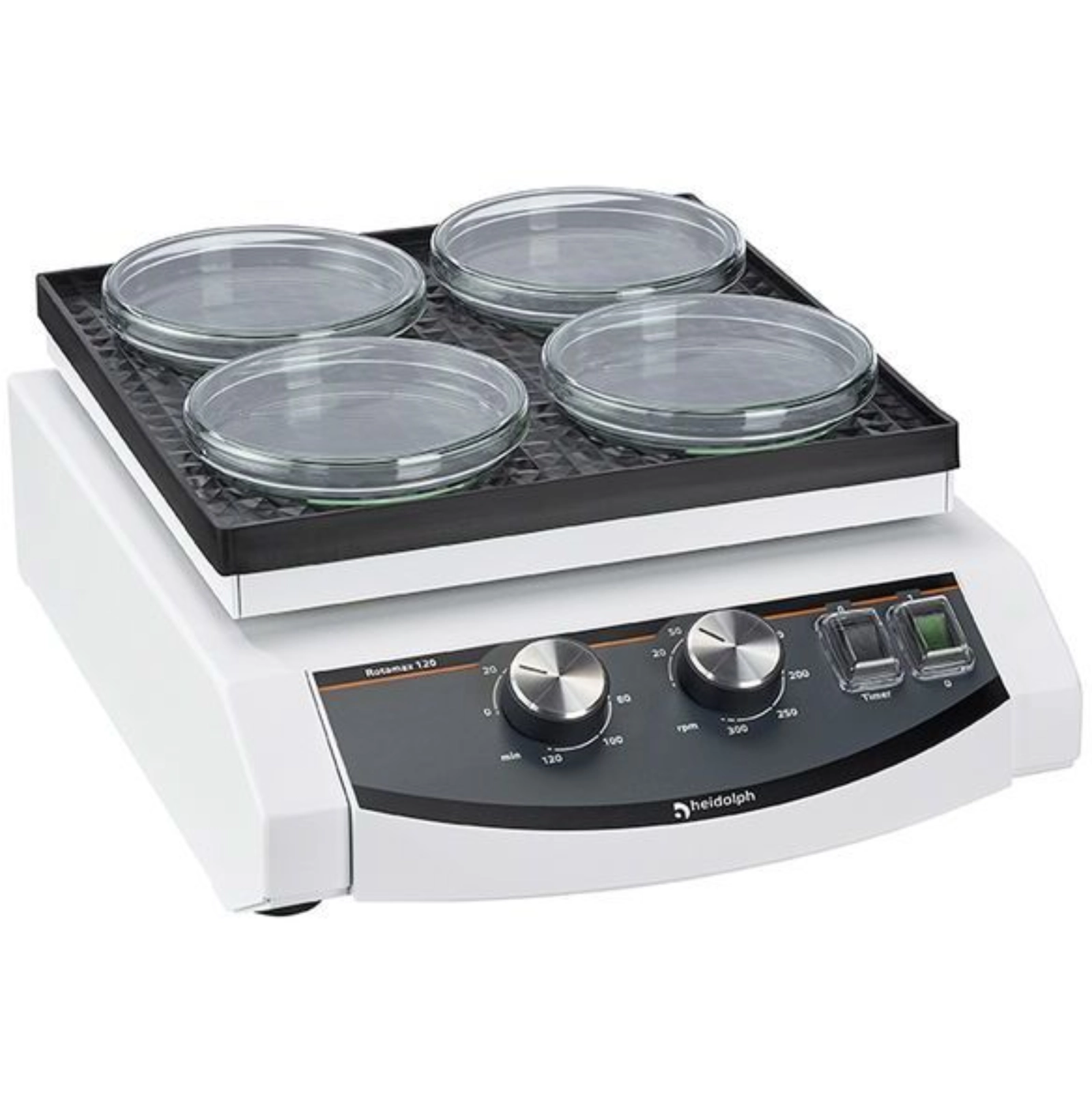 Uniwersalna wytrząsarka laboratoryjna o ruchu okrężnym Heidolph Rotamax 120 z płynnie regulowaną prędkością wytrząsania w zakresie 20-300 obr./min. Urządzenie zaopatrzono w timer umożliwiający ustawienie czasu pracy w trybie ciągłym lub ograniczonym (od 1 do 120 minut). Po zakończeniu pracy wytrząsarka automatycznie się wyłącza, a także emituje sygnał dźwiękowy, co dodatkowo zwiększa wygodę użytkowania. Orbita wytrząsania wynosi 20 mm. Maksymalne obciążenie wytrząsarki to 2 kg.
