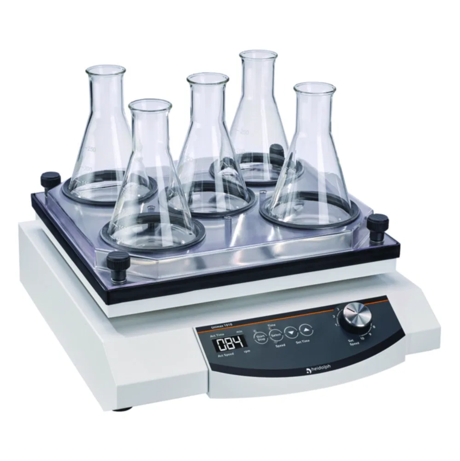 Uniwersalna wytrząsarka laboratoryjna Heidolph Unimax 1010 o ruchu okrężnym z regulowaną prędkością wytrząsania w zakresie 30-500 obr./min. Urządzenie zaopatrzono w timer umożliwiający ustawienie czasu pracy  w trybie ciągłym lub ograniczonym (od 1 do 999 minut). Orbita wytrząsania wynosi 10 mm, maksymalne obciążenie 5 kg.